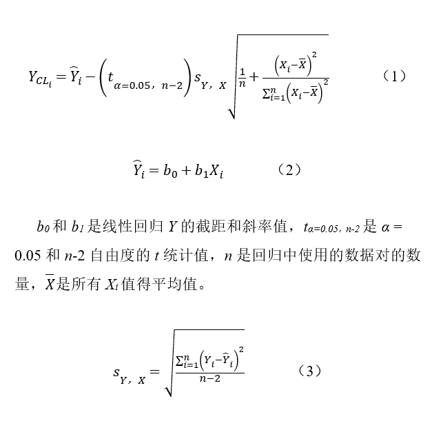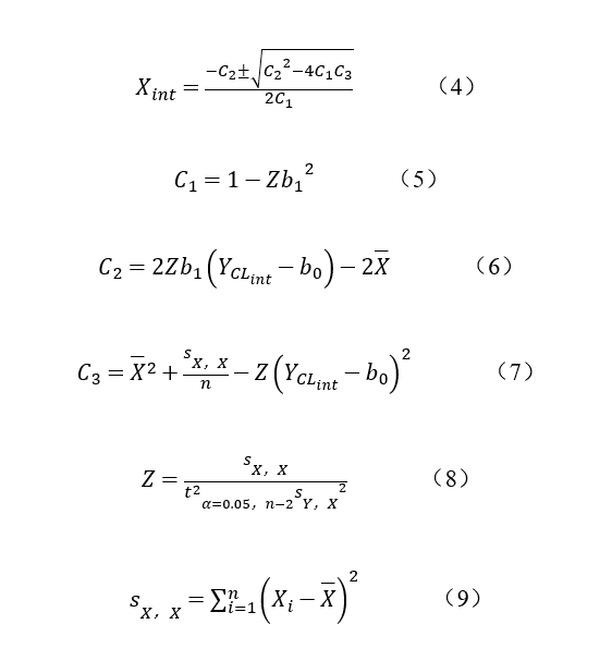 如果需要的话,可以计算对应的时间点Xi的估值结果的置信区间值YCLi,所选的时间跨度为研究持续时间,然后绘图。 在测量漂移斜率为负值的情况下,通过下面的公式计算95%置信区间下限,如果测量漂移斜率为正值,则将计算的置信区间加到估算结果上,而不是减去它。 可见稳定持续时间(Xint)可以用二次方程解出来,而不是用图形方法: YCLint是预定义为置信度截距的分析物值,Z为常数。 请注意,稳定性估值应该在研究期限内。如果计算的估计值超过了研究持续时间,则将估计值设置为最后一次测量的时间点,超出研究期限的外推是不合适的。