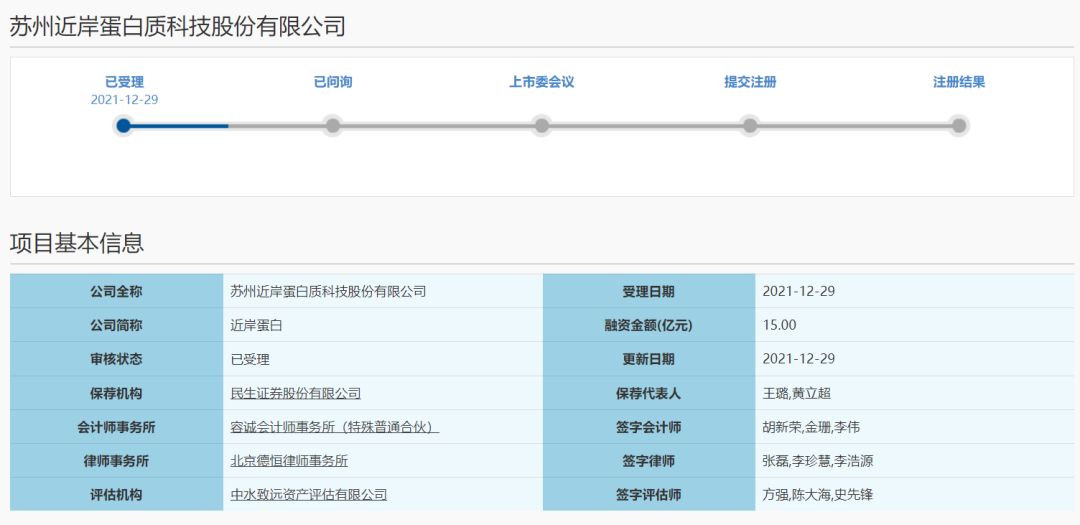 近日,苏州近岸蛋白质科技股份有限公司申报上交所科创板获受理! 苏州近岸蛋白质科技股份有限公司本次公开发行股票数量不超过约1754.39万股,本次募集资金用于项目及拟投入的募资金额为:诊断核心原料及创新诊断试剂产业化项目,拟用本次募集资金投入金额约8.05亿元;研发中心建设项目,拟用本次募集资金投入金额约5.2亿元;补充流动资金,拟用本次募集资金投入金额约1.7亿元 。 报告期内,公司主营业务实现快速增长,分别实现主营业务收入 2,598.59 万元、3,557.43 万元、17,973.38 万元及 13,108.79 万元,年复合增长率为 162.99%, 扣除非经常性损益后归属母公司净利润分别为-1,282.66 万元、-957.64 万元、 8,535.95 万元及 5,386.50 万元。 选择的上市标准 发行人符合并选择《上海证券交易所科创板股票发行上市审核规则》第二十 二条第一项规定的上市标准:预计市值不低于人民币 10 亿元,最近两年净利润 均为正且累计净利润不低于人民币 5,000 万元,或者预计市值不低于人民币 10 亿元,最近一年净利润为正且营业收入不低于人民币 1 亿元。 募集资金用途 苏州近岸蛋白质科技股份有限公司(简称近岸蛋白质),是一家专注于重组蛋白应用解决方案的高新技术企业,主营业务为靶点及细胞因子类蛋白、重组抗体、酶及试剂的研发、生产和销售,并提供相关技术服务。公司提供的产品与服务可应用于生物药、生命科学基础研究、体外诊断、mRNA疫苗药物等诸多领域。基于长期的经验积累及技术开发,公司综合了23项核心技术搭建了公司技术平台。公司突破传统蛋白设计理念,定向进化蛋白质性能,并根据客户需求研发生产出高性能抗体及符合药企生产要求的酶/试剂。同时,公司建立了规模化生产平台,突破了相关产品从实验室到大规模生产的瓶颈。公司已经推出了超过7,700种产品及服务项目,包括了2,800余种重组蛋白产品、30余种重组抗体产品,400余种酶及试剂产品、成功交付了4,500余种CRO服务项目。 公司深耕重组蛋白行业十余年,为包括亚洲、欧洲、美洲、大洋洲在内的数千家企业与科研机构提供优质的产品与服务。凭借公司在业界树立的良好口碑,公司与阿斯利康、罗氏、恒瑞医药、沃森生物、艾博生物、雅培、万孚生物、明德生物等国内外知名企业建立了合作关系,助力全球生物医药企业的的研发和生产。同时,公司高度关注行业前瞻性研究,为哈佛大学、斯坦福大学,杜克大学,美国国立卫生院、中国科学院、清华大学、北京大学、复旦大学等广大科研单位提供产品与技术支持,帮助生命科学研究顺利进行。公司重视产品质量管理体系建设,相关产品获得了应用市场及科研机构的高度认可,产品及服务相关数据被上千篇SCI论文引用。 The End |