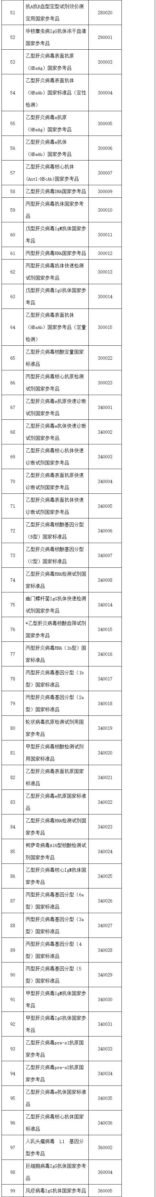 注: 1. *标识品种为本期目录新增体外诊断试剂标准物质。 2. ▲标识品种为可用于体外诊断试剂检验的化学对照品。 3. 相关品种电子版说明书可到中国食品药品检定研究院网站http://aoc.nifdc.org.cn/sell/home/search.html,点击目录查询,进行在线浏览。 4.限制供应是指仅供给相关体外诊断试剂生产企业。 5.《注册检验用体外诊断试剂国家标准品和参考品目录(第十一期)》发布之日起,《注册检验用体外诊断试剂国家标准品和参考品目录(第十期)》同时废止。