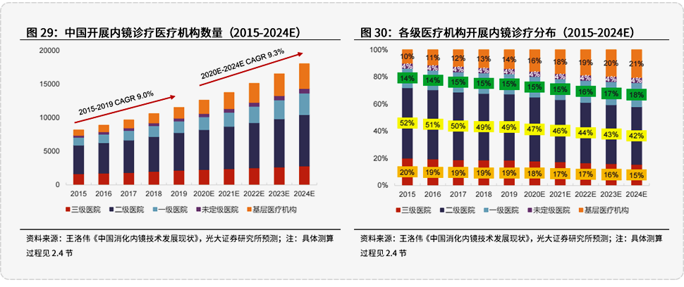 2021年,“十四五”全新开端,中国医疗卫生事业迎来加倍提速的历史拐点,构建分级诊疗新格局,推动优质医疗资源扩容和区域均衡布局,已成未来五年医疗卫生体制改革的核心命题,基层医疗被赋予全新使命。 我国属于消化道疾病高发地,消化疾病的控制和早发现主要依赖早期筛查,以日本为例,早期胃癌的内镜检出率可达70%,而我国比例仅为15-20%左右,90%以上的胃癌在发现时已是中晚期,给家庭和社会带来沉重负担。 长海医院消化内科主任李兆申教授曾表示:“这种现状很大程度上由基层检查手段不足、百姓防治意识不够造成。”并提出“防治胃癌应重心下移,沉入基层。”临床上最为常见的诊断性胃肠镜难度较低且培养医生周期较短,完全可以在基层医疗机构完成,然而,基层地区因受医疗条件所限、专业诊断医师不足,大批的患者仍然涌向三甲医院进行胃镜或肠镜检查,倍受疾病和奔波之苦。 在分级诊疗的大背景之下,提高内镜诊疗在基层医疗机构的渗透率,合理配置医疗资源提高利用效率将是我国现阶段的目标,此举带来多层含义: 于基层医疗机构而言,将有机会获得更多内镜诊疗资源,承接基础内镜诊疗职能,内镜的渗透率和配置率加速提升; 于内镜企业而言,基层医疗机构将成为内镜设备的主要增量市场。据光大证券研究报告测算,2024年中国开展内镜诊疗医疗机构中,一级及以下的占比将提升至43%。广阔市场面前,如何以合适的产品去契合基层医疗机构的需求,值得各大内镜企业去深思与规划。