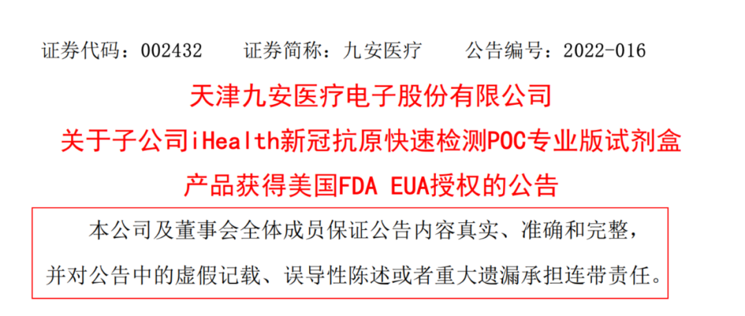 公告称,该产品须按照产品使用说明,由专业医护人员或现场护理(point of care)场景下能够熟练使用该试剂盒产品的人员采集前鼻腔拭子样本进行测试操作,15 分钟可出结果,可供专业医护人员及现场护理场景下能够熟练使用该试剂盒产品的人员在新冠肺炎的筛查工作中使用, 该产品通过应急使用授权(EUA)丰富了公司的新冠抗原检测产品线,可以更大程度的助力公共卫生防疫工作,为公共卫生防疫工作提供专业的新冠病毒检测解决方案,未来可能给公司带来相关的销售收入和业绩。 2021年11月8日,九安医疗公布了美国子公司新冠抗原家用自测OTC试剂盒获得美国FDA应急使用授权的消息。仅仅两个月的时间,九安医疗又一次拿下新冠检测试剂的FDA EUA。 值得注意的是,2022开年以来,九安医疗已连续斩获大单。 1月13日,九安医疗发公告称,其美国子公司于当地时间2021年12月21日收到美国纽约州卫生部发来的两份iHealth试剂盒订单,合计订单金额为0.65亿美元(含运费),约合人民币4.16亿元。 另外,美国子公司和美国纽约州卫生部于当地时间2022年1月10日签订了《销售合同》,向美国纽约州卫生部销售iHealth试剂盒产品,合同价税合计金额为1.2亿美元(含运费),约合人民币7.64亿元。 截止本公告日,美国子公司与纽约州卫生部的订单及合同金额累计达人民币11.80亿元(含运费、税)。 1月14日,九安医疗发布公告称,美国子公司与美国ACC(代表美国HHS)于当地时间2022年1月13日签订了《采购合同》,采购2.5亿人份iHealth试剂盒产品,合同价税合计金额为12.75亿美元(含运费),约合人民币81.02亿元。 此外,美国子公司于美国当地时间2021年12月3日至2022年1月5日期间获得美国马萨诸塞联邦及卫生与公众服务部执行办公室(The Commonwealth of Massachusetts and Executive office of Health and Human Services)的iHealth试剂盒采购订单,合同价税合计金额为1.48亿美元(含运费),约合人民币 9.44亿元。