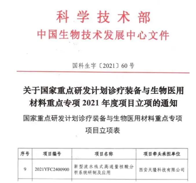 天隆牵头承担国家重点研发计划—— 新型流水线式高通量核酸分析系统研制及应用 近日,天隆科技收到国家科技部正式批复:天隆科技牵头承担2021年度国家重点研发计划“诊疗装备与生物医用材料”重点专项——新型流水线式高通量核酸分析系统研制及应用,获得正式立项。“诊疗装备与生物医用材料”重点专项申请指南在全国公开发布后,天隆科技联合项目参与单位经过申请、初评、答辩等多个评审环节,在激烈竞争中脱颓而出,获批立项。该重点专项以诊疗装备和生物医用材料重大战略性产品为重点,是我国“十四五”期间国家科技创新的重点工作之一,旨在“高端引领”,加快推进我国医疗器械领域创新链与产业链和服务链的整合,为促进我国医疗器械整体进入国际先进行列提供科技支撑。● 项目名称:新型流水线式高通量核酸分析系统研制及应用● 项目研发团队:由西安天隆科技有限公司牵头主持,与西安交通大学、苏州天隆生物科技有限公司、中国食品药品检定研究院、中国医学科学院北京协和医院、陕西省医疗器械质量检验院等领域内优势单位共同参与承担。● 项目执行期:2021年12月~2026年11月高通量、自动化、高灵敏且快速、高效的核酸检测整体解决方案是传染病、遗传病和肿瘤,以及慢病精准诊疗的关键。天隆科技此次牵头承担的“新型流水线式高通量核酸分析系统研制及应用”项目汇聚了高校、企业、质量检验、临床医院的优势研发力量,建立全链条的“产学研医检”研发合作模式,期待在核酸检测关键技术研究、产品开发及应用领域有所突破,研制出检测通量更高、检测灵敏度更好、项目组合更灵活、生物安全性能更好,更适配临床实际需求的流水线式高通量核酸分析系统,为实现各种突发传染病监测和大规模人群筛查、遗传病诊断、个性化用药、肿瘤诊疗、动物疫病检疫等重大应用提供更有力支撑。 我国的高端核酸检测设备长期被进口所垄断,为实现我国“高端医疗装备自主可控”及“高水平自立自强”,国家相继在“十一五、十二五、十三五、十四五规划”、“国家中长期科技发展规划纲要(2020年)”、“健康中国2030规划纲要战略”中发布相关政策,支持我国高端医疗设备的技术创新、产业化及相关应用。天隆科技作为一家以市场为先导、产学研为基础、追求自主品牌的创新驱动型高科技企业,多年来凭借在核酸检测、分子诊断领域深厚的技术积淀,获得国家多个科技计划的滚动连续支持。先后牵头主持了国家重大科学仪器设备开发专项、国家传染病防治重大专项、国家863计划、国家科技支撑计划、国家重点研发计划“重大科学仪器设备开发”重点专项、国家发改委产业化专项等多个国家重大科研项目。20余年来,天隆科技埋头攻关,刻苦钻研,攻克高端核酸检测设备系列“卡脖子”技术难题,成功研发及产业化数百个高端核酸检测设备及配套分子诊断试剂,打破进口垄断,形成了涵盖样本前处理、核酸提取、扩增检测等分子诊断全技术链条的多个仪器试剂产品,构建可满足传染病核酸检测疾病防控、临床诊断、食品安全、检验检疫等多应用领域需求的高通量多靶标核酸自动化定量检测系统解决方案和产品组合,牵头制定了国家医药行业标准《YY/T1717-2020核酸提取试剂盒(磁珠法)》,填补国内空白。上述核心技术及产业化产品应用获得2020年度“国家科技进步奖”,公司创始人团队彭年才教授、总经理李明博士,首席技术官苗保刚博士分列本奖项的前三完成人。领军企业靠的是科技研发团队和国家级领军人才,上述国家科技奖励的获得,既是对国家战略科技成果的肯定,同时也赋予了我们未来新的使命和担当。 在“十四五”的开局之年,项目团队牵头获批国家重点研发计划重点专项,是我们新征程的良好起点,我们将不忘初心,牢记使命,不断进取,开拓创新。专注核酸检测,满足国家重大需求,尽最大努力为实现我国高水平科技自立自强不断添砖加瓦。