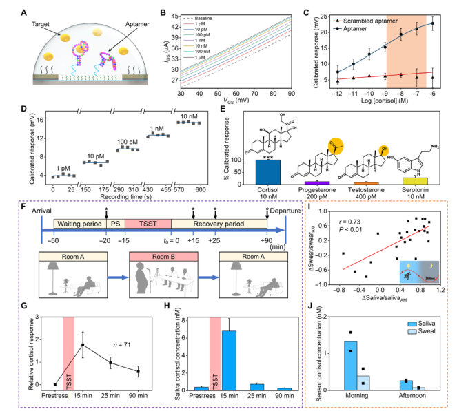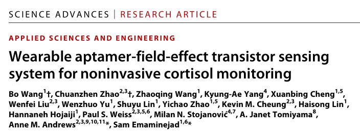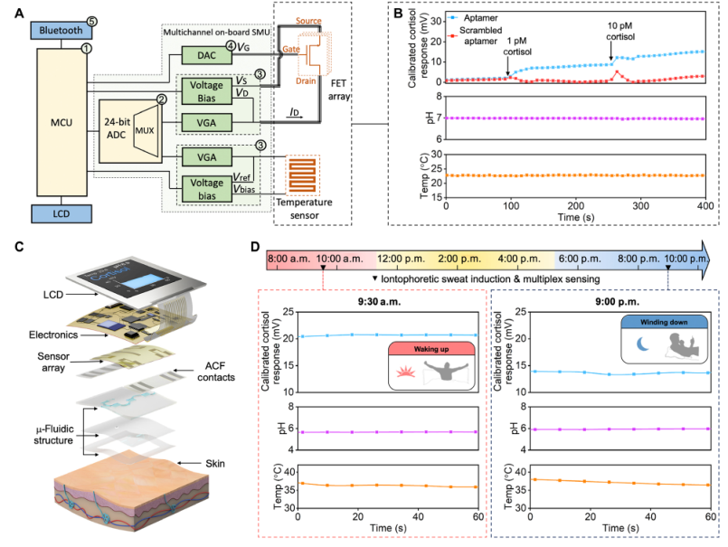 可穿戴监测技术能够通过提供个性化、可操作的反馈改变身体和认知表现,促使人们采用更健康的生活方式。可穿戴传感器可检测和量化可回收生物流体中的生物标记物,提供人类动态生理和心理状态的特定信息。人体传感系统已被用于测量汗液中的生理信息指标,包括pH值、电解质、代谢物或营养水平。 然而,许多低浓度、潜在信息丰富的生物标记物无法通过可穿戴传感系统获取。因此,可穿戴传感器的潜在用途仍然局限于少数狭窄应用。皮质醇——一种关键的应激生物标志物,在低纳摩尔浓度下存在于汗液中。以前的可穿戴传感系统仅限于监测微摩尔-毫摩尔范围内的分析物。此外,现有的可穿戴系统既不具备捕获生物标志物生理相关变化所需的分辨率,也不具备动态能力进行准确、无缝地进行测量。 近日,来自于UCLA以及哥伦比亚大学的研究团队在Science Advances发表了一篇题为“Wearable aptamer-field-effect transistor sensing system for noninvasive cortisol monitoring”文章。研究团队开发了一种灵活的场效应晶体管(FET)生物传感器阵列,该阵列利用了以前未报道的皮质醇适体偶联到In 2 O 3 的纳米薄膜FET上。研究团队通过跟踪Trier社会压力测试参与者的唾液皮质醇水平确认了皮质醇作为压力生物标志物的生理相关性,并建立日间唾液和汗液样本中皮质醇之间的相关性。这些相关性推动了基于适体场效应晶体管阵列的智能手表的开发和体内验证,该智能手表配备了定制、多通道、自参考和自主源测量单元,可实现无缝、实时的皮质醇汗液传感。 图片来源:Science Advances 主要内容 01 无创皮质醇生物标记物监测概述 使用可穿戴适体FET传感系统进行无创皮质醇生物标记物监测。图片来源:Science Advances 皮质醇是一种低浓度的生物标志物,它是应激反应性下丘脑-垂体-肾上腺轴的关键组成部分。皮质醇失调发生在重度抑郁症、焦虑症、创伤后应激障碍、肥胖、库欣病和艾迪生氏病。有研究表明个体皮质醇水平与神经行为发展轨迹和个人行为有着紧密的联系。 临床研究表明,唾液和血液中游离皮质醇水平之间存在显著相关性,汗液中的皮质醇也存在类似的相关性。为了以可穿戴的形式监测低浓度、小分子生物标记物,如皮质醇,研究团队设计、开发并研究了基于场效应晶体管(FET)阵列的传感系统。该阵列利用了一种新发现的皮质醇适体(作为生物认知元件)耦合到FET的纳米通道中(作为信号转导平台)。基板被嵌入一个薄膜微流控装置中,以形成一个可粘附皮肤的生物流体采样、布线和分析模块。通过部署基于aptamer FET阵列的smartwatch,实现了无缝实时的生物标记物数据采集。不仅如此,适体场效应晶体管传感器是通用的和模块化的。它们可以直接以可穿戴和移动的形式适应其他生理生物标志物,包括汗液(或其他体液)中低浓度的目标。 02 皮质醇适体FET传感器的研制与验证 研究团队成功找到了一个以前未知的DNA适配子序列,该序列可直接识别人类应激激素皮质醇。 TSST,一种金标准实验室程序,用于在人类参与者中可靠地诱导应激,以确定应激诱导的唾液皮质醇升高。唾液皮质醇水平通过标准实验室分析,即液相色谱串联质谱(LC-MS/MS)或酶联免疫吸附试验(ELISA)进行定量。唾液皮质醇浓度在应激15分钟后达到峰值然后在75分钟内下降。研究团队使用皮质醇适体FET装置分析了一名TSST代表参与者的唾液样本。FET传感器测量显示,应激15分钟后,皮质醇出现峰值,随后应激90分钟后,皮质醇恢复到基线水平,这与标准实验室分析显示的趋势一致。唾液和汗液皮质醇水平之间的相关性为0.73,支持唾液和汗液皮质醇水平之间的相关性。 皮质醇适体FET传感器的生物学适用性 图片来源:Science Advances 03 无线可穿戴适体FET阵列的smartwatch, 用于实时人体汗液分析 研究团队整合了一个微流控模块和一个由110毫安时锂聚合物电池供电的液晶显示器(LCD),以生产“智能手表”。通过移动电话应用程序,smartwatch可以在设定的时间获取实时测量值(即皮质醇、pH值和温度)时间间隔。smartwatch的实时录制结果显示,皮质醇通道检测到夜间出汗皮质醇水平下降,与典型的昼夜节律和我们的离体相关研究观察结果一致。 基于适体FET阵列的smartwatch,用于实时人体汗液分析 图片来源:Science Advances 总结 研究团队开发了一种灵活的场效应晶体管(FET)生物传感器阵列,并推动了基于适体场效应晶体管阵列的智能手表的开发和体内验证,该智能手表配备了定制、多通道、自参考和自主源测量单元,可实现无缝、实时的皮质醇汗液传感。 从临床角度来看,鉴于汗液是一种相对未充分开发的生物流体,制定标准方案(例如,基于汗液的TSST)将有利于形成以汗液为基础的生物标记物研究为中心的大规模、动态和纵向研究的基础。基于适体FET阵列的smartwatch产生的数据可以与其他用户特定的静态和动态信息相关联,以提供监测疾病状态的客观标准(例如,激素失衡)医嘱,如库欣病和艾迪生病,协助诊断抑郁症),并向用户提供个性化反馈,以及时告知干预措施。 |
