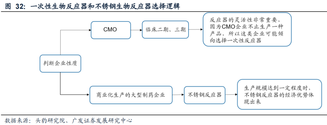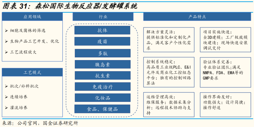 药明生物尽管在昨日早盘紧急停牌旨在消除市场误解和恐慌情绪,早盘开盘近10%的涨幅一度让投资者看到了收复失地的希望,最后还是没有止住短期资金的抛售。 尽管有专家指出药明此次被列入清单的源头物项对于美国来说并非多核心的东西,对未来国内企业进口相关领域的产品影响不大。但这次的事件,也让CDMO、药企同行产生了投鼠忌器的心理,可以预见的是,大家都在着手准备替代美国供应商的应急清单,以防突发事件;同时,下游制药企业将更多的考虑采购国产生物反应器设备、零件及相关耗材。长远来看,这不仅是国内生物反应器及制药装备行业认可度提升的契机,同时还能够吸引市场情绪的共振。曾记得当初赛默飞进口培养基携带新冠病毒的事件,也是警醒了市场供应链自主可控的重要性,从此开启了生命科学产业上游板块的一波小高潮。随着PD-1为首的单抗类药物持续的放量,以及新的大分子药物领域ADC、双抗等重磅品种的上市,大量生物药企、CXO进行产能扩张是大势所趋。 产能扩张狂潮下,生物反应器的细分赛道机会不可忽视。1、生物反应器在生物药制备中扮演的角色,市场前景几何?生物反应器是指用于微生物和细胞体外培养,通过生化反应或生物自身的代谢等来获得各种目标产物、药物的装置,最终目的是为了达到细胞高密度增长,高效地产出具有医药价值的酶、单抗、疫苗等产物。生物反应器又被行业誉为是“国产高端生物药研发生产的基石”,在生物制药生产环节中扮演不可或缺的角色,可以帮助企业提高生产效率,降低生产成本。据Markets and Markets统计,2020年全球一次性生物反应器、一次性袋子及其配件的市场空间达17亿美元,预计到2025年将增至39亿美元,年复合增速达到18%。中国市场的弹性无疑更为惊人。据浙商证券推算,中国的生物反应器、一次性袋子当前市场空间在30-40亿元 ,预计2025年市场空间有望超过60亿元,市场增速有望达到30%左右,且以上测算均不计入新冠疫苗相关的需求增量。尽管看起来生物反应器的市场规模并不大,但它是制药装备耗材产业链整合的设备端入口,可以理解为导流的概念。 在整个制药的工艺流程中,许多特殊耗材是搭配固定仪器来使用的,生物反应器作为上游细胞培养的入口设备,如果厂商产品性能和品类足够全面,自然占据一定连带销售优势。以巨头赛多利斯为例,其一开始围绕一次性生物反应器设备及耗材等制药装备上游领域布局构筑核心竞争力,后拓展生物药下游(纯化及超滤等)业务,形成生物药生产一体化平台。按照材质来分,生物反应器又可分为一次性生物反应器和不锈钢生物反应器。大型不锈钢生物反应器设施的规划、建造、确认和许可可能需要三到五年或更长的时间,一般后期管线单薄的Biotech不会选择不锈钢罐的产能规划,药企如果在不能保证未来多产品线获批且这些获批产品需要较大生产能力,那么贸然投建可能造成较大的投资风险。反之,一次性反应器设施是替代不锈钢罐的最优选择,小型模块化一次性生物反应器的建造速度更快,所需资金、时间比不锈钢生物反应器设施少得多。生产商可以在药物管线获批确定性更高的临床中后期开始投入设施建造,从而降低过早的投入大型产能的风险。以药明生物为代表的CDMO企业,为了满足不同管线阶段的客户要求,大部分更倾向于使用一次性生物反应器,以减少批次间污染。 而对于已有管线商业化生产的大型药企,更倾向于使用不锈钢生物反应器。根据2021年H1财报,国内药企的产能建设以一次性反应器为主,大部分是2000升的生产规模。为了应对PD-1医保谈判的降价压力,百济神州和信达生物已开始转向不锈钢生物反应器生产线(单位平均生产成本更低)的建设,这将进一步降低生物药的生产成本。目前,国内生物反应器的国产化率仍然低于20%,一方面国产厂商与进口厂商的性能仍然有不小差距;另一方面,如不锈钢罐设施为一次性投入,国产产品的价格优势不足以撼动下游客户的购买决策。东富龙可以说是国内生物药制药装备产品梯队丰富度最高的公司之一,在生物反应器领域,在市产品不仅覆盖不锈钢系统和一次性反应系统,同时2020年后收购了苏州海崴、千纯生物,加强了耗材与填料领域整合。值得一提的是,在一次性生物反应器领域,以东富龙产品的与进口厂商相比,公司一次性细胞扩增系统在部分关键参数上已接近海外设备水平。 截至2021年7月底,楚天科技在生物药制备上游领域覆盖了不锈钢反应发酵系统、层析分离纯化系统、配液系统等相关产品,随后,公司新推出波浪式生物反应器、全自动微载体悬浮培养生物反应器、篮式生物反应器等,进一步提升了产品组合丰富度,新覆盖CGT疗法研发客户。另外,公司还在上海建设六千平米的新厂房,规划进行一次性生物反应器、配液袋、储液袋及其膜材等产品开发和生产,预计将在今年形成销售。港股的森松国际,在生物反应器/发酵罐系统也有丰富产品线储备,出口海外服务疫苗、单抗、胰岛素等国际知名药企,同时也是玉溪沃森mRNA疫苗工厂项目的供应商。