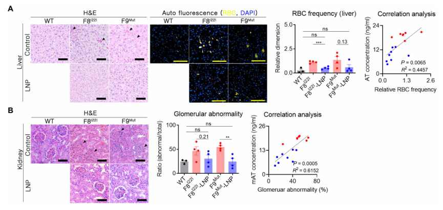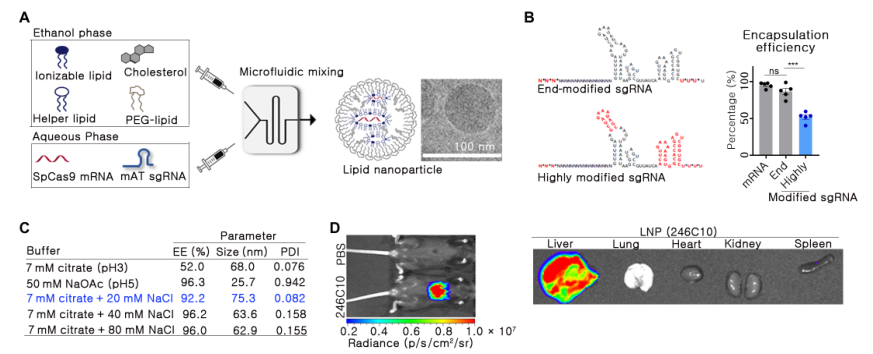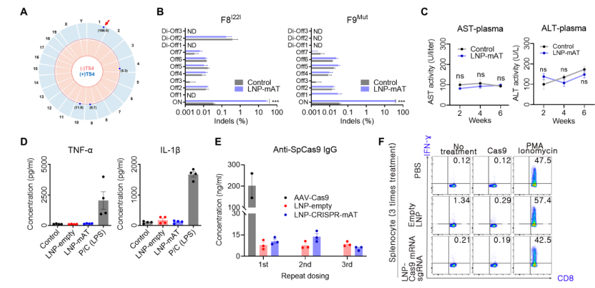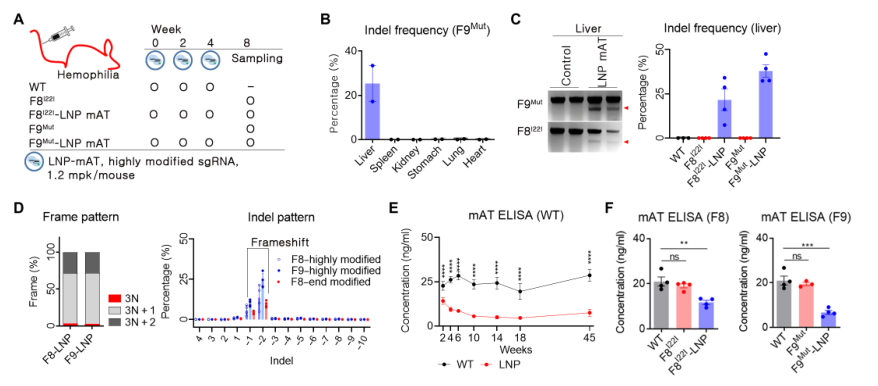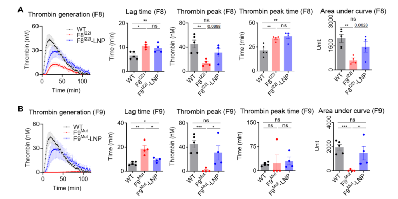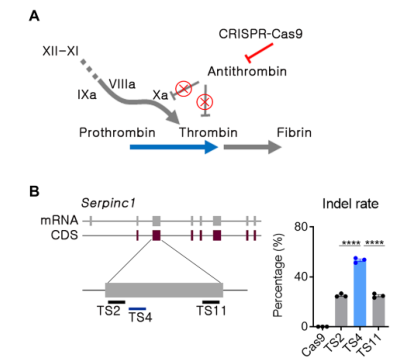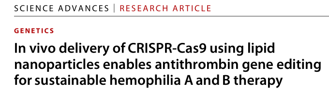 血友病是一种典型的遗传性疾病,由与内在、外在和共同凝血途径相关的基因功能丧失引起自发性出血。一种基本的治疗方法尚未开发出来,血友病A和B是基因治疗最突出的目标之一。血友病最常用的治疗方法是预防性治疗,根据血友病的类型补充缺乏的凝血因子。腺相关病毒(AAV)基因治疗已经经过临床试验,并证明在恢复凝血因子缺陷方面有效。然而,这种方法不适用于存在凝血因子VIII(FVIII)抑制物或FIX抑制物的患者,分别占血友病A和血友病B病例的30%和10%。抑制物是中和抗体,95%的重度血友病患者在FVIII替代治疗的前75天内产生抑制物。 最近,针对产生抑制物的患者提出了各种治疗策略。Emicizumab是美国食品和药物管理局(FDA)批准的双特异性抗体,已在临床上用于使用抑制剂治疗患者,以模拟FVIII功能,将下游凝血途径的FIX和FX连接起来。然而,这种方法要求患者在一生中反复注射药物。Fitusiran是一种以抗凝血酶(AT)为靶点的RNA干扰疗法。AT是凝血酶生成的内源性负调节因子,由serpin家族C成员1(SERPINC1)基因编码。使用Fitusiran抑制AT已被证明是一种有效的方法,可以在不直接表达凝血因子的情况下恢复凝血系统的平衡。这种方法是一种有吸引力和多功能的策略,因为它适用于大多数血友病患者,而不考虑导至疾病的因素或抑制物的出现。然而,这种策略的一个局限性是fitusiran的短期治疗效果。到目前为止,所有已被批准用于治疗血友病的策略都只会产生暂时的治疗效果。然而,重复治疗会对血友病患者的生活质量产生负面影响。近年来,血友病患者的预期寿命增加,因此需要更长时间的定期治疗,获得可持续和安全的长期疗效一直是血友病治疗中最关键的考虑因素之一。在这方面,基因治疗适合于维持长期的治疗效果。 迄今为止,基因组编辑被广泛认为是长期治疗几种遗传性疾病和一些慢性疾病的有效策略。与病毒载体方法相比,使用非病毒载体交付基因组编辑工具在安全性方面具有相对优势。Cas9蛋白可诱导细胞免疫反应,这种免疫原性与安全性问题有关。相比之下,由于CRISPR-Cas9的瞬时表达,非病毒给药方法减少了靶外效应。因此,最近的研究主要集中在非病毒给药系统上,例如脂质载体,作为体内基因组编辑疗法的更合适的给药工具。 近日,来自韩国的研究团队在Science Advances上发表了一篇题为“In vivo delivery of CRISPR-Cas9 using lipid nanoparticles enables antithrombin gene editing for sustainable hemophilia A and B therapy”的文章,在文章中,研究团队开发并优化了脂质体纳米颗粒(LNPs)将Cas9 mRNA和靶向小鼠的有效单链引导RNA(sgRNA)一起传送到小鼠肝脏的方法。接下来,在血友病A和B小鼠模型中评估mAT基因编辑介导的凝血酶生成,以确认所开发系统的治疗效果。在这里,研究团队证明了使用LNPs在体内输送CRISPR-Cas9能够进行AT基因编辑,从而实现血友病A和B的可持续治疗。 图片来源:Science Advances 主要内容 1. 体外筛选筛选SERPINC1基因中有效的sgRNA 对于通过mAT基因组编辑进行血友病治疗,基于最小的脱靶风险研究团队选择了靶向Serpinc1外显子3的候选sgRNA。将11种不同的sgRNA转染到小鼠C2C12细胞系中,通过定向深度测序分析插入或删除(indel)频率。结果显示TS4 sgRNA是拥有最高indel频率。在小鼠原代肝细胞中测试sgRNA时,得出相同的结论。因此选择TS4 sgRNA进行进一步的LNP介导的小鼠体内研究。 体外筛选针对AT区域的有效sgRNA 图片来源:Science Advances 2. 小鼠体内肝细胞转染的LNP缓冲液成分的优化 对于Cas9 mRNA和sgRNA的体内递送,LNP使用246C10、二油基磷脂酰乙醇胺(DOPE)、胆固醇和聚乙二醇(PEG)-神经酰胺配制。在这项研究中,研究团队使用了一种高度修饰的sgRNA,以有效地诱导在所需剂量下进行靶向基因组编辑。研究团队以极其啰嗦的笔触描述了他们优化缓冲液成分的过程以及对高度修饰的sgRNA在LNP的包封效率的影响。有兴趣的小伙伴可以去原文查看,在此不赘述,因为我的稿费不按字数计算。 接下来,研究团队通过静脉途径引入含有荧光素酶的LNP,证实了LNP的器官特异性输送潜力。小鼠肝脏表现出荧光素酶表达,但其他器官没有表现出可检测到的荧光素酶表达。 肝细胞转染的LNP缓冲液成分的优化 图片来源:Science Advances 3. LNP-CRISPR-mAT诱导mAT在小鼠体内表达的长期下调 在优化用于特异肝细胞输送的LNP CRISPR mAT后,开始尝试体内mAT靶向输送。在人类中,血友病A和B是凝血障碍的典型类型。血友病A是最常见的血友病类型,是FVIII基因(F8 I22I)第22内含子反转导至的严重的凝血疾病。血友病B是由FIX基因(F9 Mut)功能丧失引起的。因此,本研究中使用了具有F8 I22I和F9 Mut的小鼠;这些小鼠是通过CRISPR-Cas9介导的基因编辑产生的,并对血友病表型进行了验证。作为试验剂量,我们每隔2周通过静脉途径给每只小鼠注射1.2 mg/kg LNP CRISPR mAT。在F8 I22I和F9 Mut的肝组织中分别观察到平均22%和38%的indel频率。当高度修饰的sgRNA和SpCas9 mRNA被包装在LNP中并反复给药时,与对照WT小鼠的平均mAT值相比,Serpinc1基因功能下调70%以上,并且Serpinc1下调在此后的10个月内保持稳定。在F8 I22I和F9 Mut小鼠中,血液mAT浓度分别降低了约40%和70%。 LNP-CRISPR-mAT诱导mAT在小鼠体内表达的长期下调 图片来源:Science Advances 4. 在血友病小鼠中使用LNP CRISPR mAT恢复凝血酶生成活性 研究团队使用了(calibrated automated thrombin, CAT)生成的方法来评估凝血障碍。CAT可以在100分钟内测
