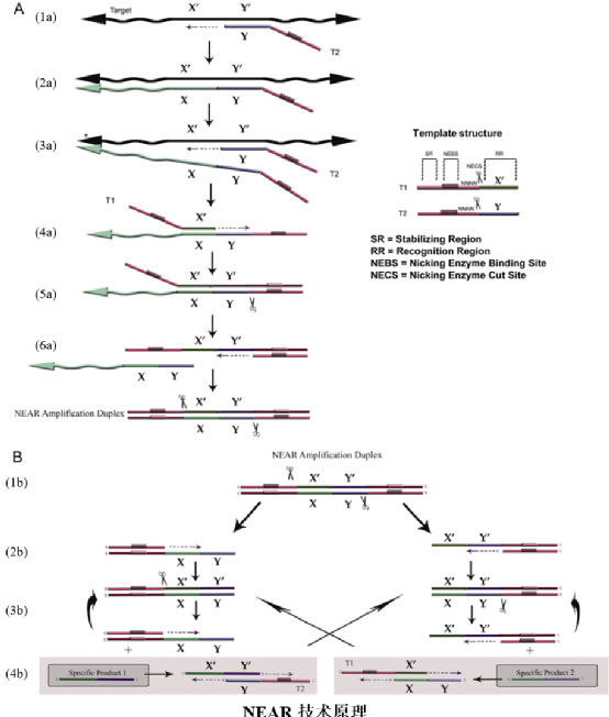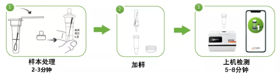 在全球新冠疫情期间,时有媒体报道家庭自检神器的各种优势,特别是关于核酸分子检测的家庭自检产品,虽不是每一个都很惊艳,但总能引起一阵轰动。这些产品在媒体的宣扬下,总是显露出“以快制胜”的特点,从雅培的ID NOWTM“最快5分钟确定阳性结果,13分钟确定阴性结果”,到先达的基因镜“技术突破,10分钟完成检测”。它们的“快”到底体现在哪?难道也就只有“快”这一特点吗? 01 雅培ID NOWTM 1.技术原理 ID NOWTM是雅培通过收购Alere后获得的检测平台,从其公布的甲/乙型流感病毒检测方法上看,该平台采用的技术为切口酶扩增反应(Nicking Enzyme Amplification Reaction, NEAR),是一种基于切刻内切酶切割特性的恒温扩增方法,详细技术原理如下: (1)设计一对含有酶切位点的引物,其5’端到3’端包含稳定区域、切刻内切酶结合/切割区域、靶标配对区域。反应过程中,引物的靶标配对区域与目标序列结合,并在DNA聚合酶作用下延伸扩增,从而引入切刻内切酶识别序列(图A中的1a~3a)。最后在上下游引物参与引发的合成过程中,形成两端含有切刻内切酶识别序列的双链DNA(图A中的4a~6a)。 (2)反应体系中添加有切刻内切酶(Nicking Enzyme),该酶与限制性内切酶不同,其识别特定序列后,并不直接切断DNA双链,而是在其中的一条链上产生缺口,并暴露出游离的3’端,从而可作为引物,在DNA聚合酶作用下启动扩增,由切口处继续合成新链。同时,体系中的DNA聚合酶具有链置换功能,可置换出下游的DNA链(图B中的1b~2b)。 (3)被置换出的DNA链可作为模板,其3’端序列与引物的靶标配对区域结合,分别由5’端向3’端延伸,形成一端含有切刻内切酶识别位点的双链DNA(图B中的3b~4b)。 (4)一端含有切刻内切酶识别位点的双链DNA又可被切刻内切酶识别并切割,再次启动扩增并置换出下游DNA链,该单链DNA与另一条引物的靶标配对区域结合并延伸,同样形成另一端含有切刻内切酶识别位点的双链DNA,由此形成循环扩增过程,产生大量产物。 (5)反应体系中加入荧光标记的探针,可与扩增后的靶标序列结合并产生荧光信号。在一定时间内,ID NOWTM会采集荧光信号,当信号到达设定阈值时则判定为阳性。 另外,雅培通过收购也获得了RPA专利,拥有这两项恒温扩增技术的专利,该平台或许可根据检测项目选择使用其中一种技术。关于RPA的技术原理,可查看充满想象力的恒温扩增技术:RPA、RCA、SDA、HDA,也可参考下文的ERA技术。 2.操作过程 ID NOWTM的仪器在打开前盖后,里面有两个反应腔室,一个用于样本前处理(蓝色部分),另一个用于扩增检测(橙色部分),分别对应着检测试剂盒的两个组件:样本收集器(SampleReceiver)和检测基座(Test Base)。单人份检测试剂主要包含三个组件:其中样本收集器含有样本处理液,用于释放样本核酸;检测基座包含反应管,装有冻干后的扩增检测试剂;还有一个转移管(Transfer Cartridge),用于处理后的样品转移,带有吸液和排液功能。具体检测过程如下: (1)打开仪器盖子后,在扩增检测位置放上检测基座,仪器可扫描信息确定检测项目;再在样本前处理位置放上样本收集器,预热约3分钟。 (2)预热完成后,撕开样本收集器上的密封膜,用移液枪吸取200μL液体样本加入样本收集器中,或直接将采集后的拭子置于样本处理液中来回搅拌,释放核酸,该过程操作时间大概为10秒。 (3)将转移管扣于样本收集器上,自动吸取样本,再手工移动至检测基座上,扣上转移管,样品释放至检测管中,盖上盖子,仪器开始检测,并自动报告结果。 (4)反应结束后,将转移管-检测基座-样本收集器三者扣紧后丢弃。 从操作过程上看,人工操作步骤比较简单,总体检测时间也较短,但等待时间碎片化、操作步骤需人为衔接等过程,使得操作简便性略显不足。 02 先达的GENEYE® 1. 技术原理 GENEYE®(基因镜)是苏州先达基因科技有限公司最近公开的一款微型核酸荧光检测仪,搭配其自主开发的新一代核酸检测技术(New ERA),可实现全程10分钟的现场化检测。其扩增方法酶促重组扩增技术(Enzymatic Recombinase Amplification, ERA)是一种类似RPA的恒温扩增技术,详细反应原理如下: (1)反应体系中的特异性上下游引物分别与重组酶等蛋白结合形成复合体后,将扫描双链DNA模板,搜索与引物同源的靶标序列。 (2)复合体识别并定位至同源靶标序列后,重组酶解开双链结构,并使引物置换出模板的互补链,同时单链结合蛋白结合至被置换出的单链DNA上,稳定单链结构。 (3)在ATP水解供能下,重组酶解离暴露出引物3’端,DNA聚合酶随即结合至引物上,启动DNA扩增。 (4)DNA聚合酶延伸过程中,同步解开DNA双螺旋结构,合成新的扩增产物。 (5)产物同样可作为模板参与扩增,在重组酶、单链结合蛋白和DNA聚合酶等相互协作下产生大量扩增子。 ERA的最适反应温度为37~42℃,是一种体温扩增技术,对仪器温控系统要求较低。多个酶作用下,促使反应体系在恒温条件下快速扩增,使得痕量核酸模板扩增到可检出水平。先达基因基于ERA技术开发了常规电泳检测、实时荧光检测和试纸条可视化检测等多种快速检测试剂;同时开发了免提取的核酸释放剂,用于样本的快速处理;也基于其单分子荧光检测技术,研发了集恒温扩增与荧光信号检测于一体的荧光恒温扩增仪。可能正是基于这些核心技术,才汇聚成就了一款简单快速的小型化检测设备。 2.操作过程 基因镜非常小巧,重量仅为200g,可通过手机连接后,在手机APP上操作