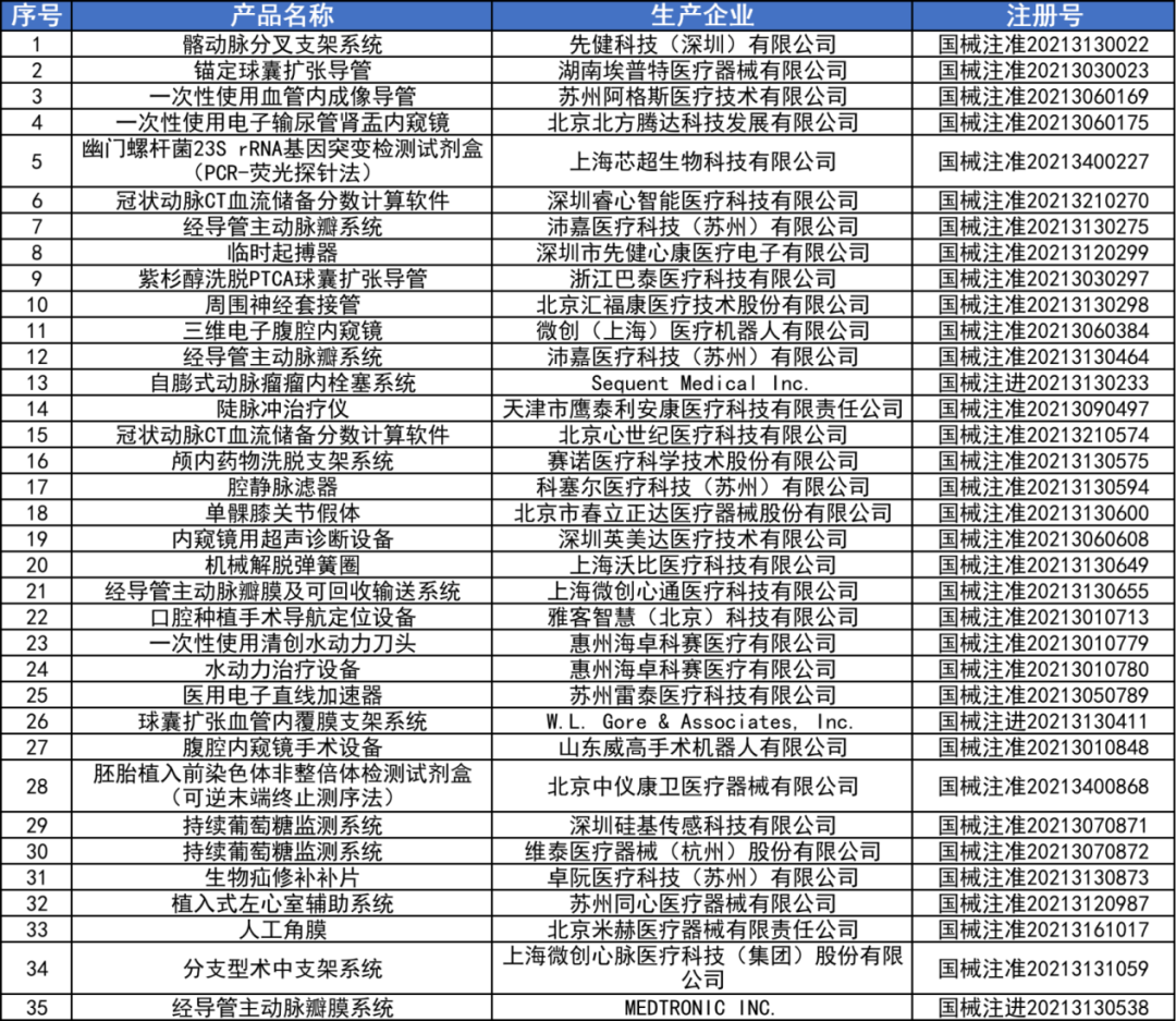 ▲ 图片来源:众成医械 2021年获准上市的创新器械产品汇总 自2014年截止2021年底目前国家药监局已批准 134 个创新医疗产品上市,在获批的产品当中有不少产品在全球范围内实现了技术“无人区”的突破。 其中2021年有 35 项创新医疗产品获批上市,相较于2020年的 26 项增加9项,并且每年获批数量呈现逐年上升态势。2021年,四个省市获批数量较多分别是广东省 7 项、北京市 7 项、江苏省 7 项、上海 5项,此四省总和占2021获批总和的76%。此外,35 款创新产品中,无源项目17件,数量最多,医用监察和监护器械、医用软件和眼科器械紧随其后,同为4件。除临床检验器械外,其他类别的医疗器械均有Ⅲ类产品获批上市。有源项目 16 件,IVD体外诊断 2 件。