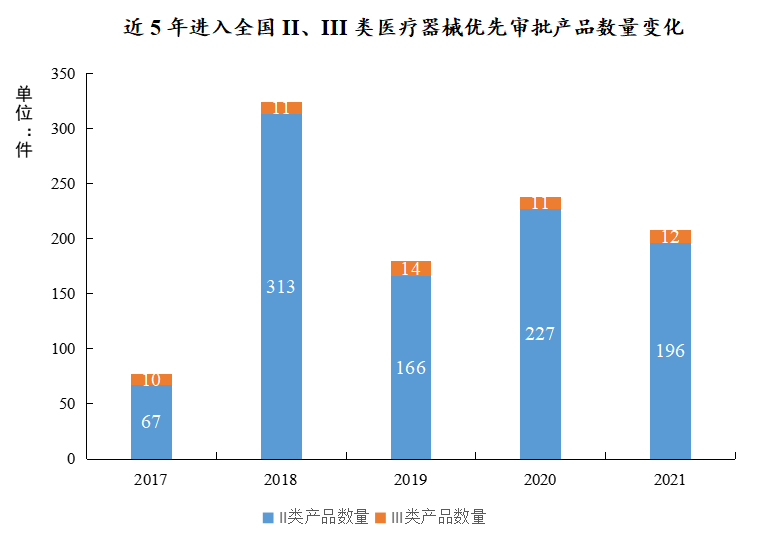 ▲ 图片来源:医疗器械创新网 2021年这进入创新医疗器械特别审查通道的60个项目,以广东、上海、浙江三省成绩亮眼,其中广东 12 件,上海 12 件,浙江 9 件,江苏 4 件,北京 3 件......此外,其中有源项目 34 件;无源项目 24 件;IVD体外诊断 2 件。 2021年全国进入优先审批通道产品汇总 据统计,2021年全国进入优先审批通道医械产品数量达208件,同比下降12.2%。其中,II类和III类产品分别有196件和12件。