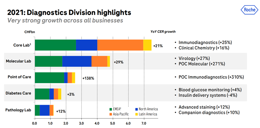 罗氏诊断各细分业务不同地区的营收和增长率: