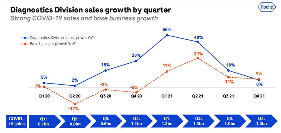 罗氏诊断2020年Q1到2021年Q4的增长情况如下图,其中蓝色是罗氏诊断每个季度的总体营收增速,橙色是罗氏诊断除新冠以外业务营收的增速,新冠业务的总体营收两年加起来一共为71亿瑞士法郎(约77亿美元)。