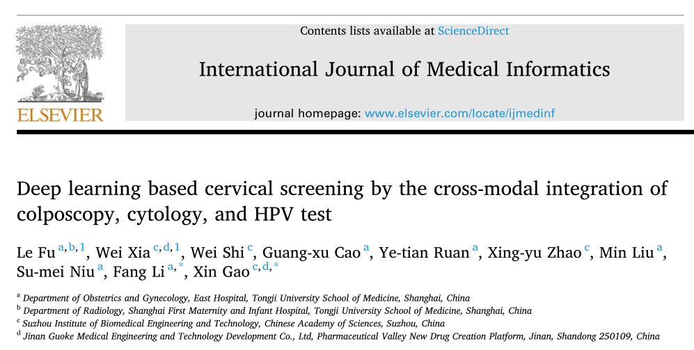 | 根据世界卫生组织的数据显示,宫颈癌是全球女性第二高发癌症,2020年全球新增宫颈癌患者60万例,并有大约34万名患者因此失去生命。宫颈癌由人乳头瘤病毒(HPV)持续感染而引起,尽管目前HPV疫苗有效降低了宫颈癌的发生率,但是整体上来说疫苗的覆盖率仍不充足。因而,通过宫颈癌筛查确定宫颈上皮内瘤变(CIN)或宫颈癌水平对于及时预防或治疗宫颈癌至关重要。目前来说,宫颈细胞学检查和HPV检测是常见的非侵入性初级筛查方法。但是,就宫颈细胞学检查来说,由于一些女性细胞学检查中的涂片未能采集宫颈病变区域的样本,敏感性往往比较低。另外,就HPV检测来说,只有感染时间长的人才会发展为高CIN水平或癌症,所以HPV检测灵敏度高但特异性较低。阴道镜检查是根据结肠镜对宫颈图像的解释,用于进一步检查细胞学或HPV检测异常的女性,它是侵入性的,可能会导至出血或感染。因而,需要一种基于现有临床检查的无创、客观、准确的宫颈筛查方法。 近日,来自中国科学院苏州生物医学工程技术研究所的研究团队提出了一种跨膜态融合细胞学检查、HPV检测和阴道镜图像检查结果的宫颈病变无创筛查方法,筛查准确率高达92.1%,显著优于单一筛查方法。研究结果以“Deep learning based cervical screening by the cross-modal integration of colposcopy, cytology, and HPV test”为题,发表在国际医学信息学协会官方期刊International Journal of Medical Informatics(IJMI)上。