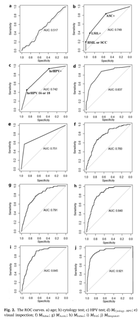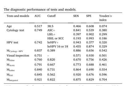 在这项研究中,研究团队利用深度学习方法构建了阴道镜图像自动筛查模型,输出患者病变概率,实现了阴道镜图像客观定量的解读。他们还对细胞学检查结果和HPV检测结果进行类别编码,采用逻辑回归方法将类别编码与阴道镜图像自动输出的病变概率跨膜态融合,最终构建了宫颈癌综合筛查模型。 研究团队在研究中一共纳入了2160名女性的检查数据,其中正常或低级别病变1718名,高级别病变或宫颈癌442名。2)接受细胞学检查、HPV检测、阴道镜检查、阴道镜活检。1)缺乏下列宫颈影像之一:生理盐水影像、醋酸影像、碘影像;研究人员使用生理盐水影像、醋酸影像、碘影像三种图像开发和测试基于阴道镜的深度学习模型,结合基于单图像模型,采用多变量logistic回归建立了基于多图像的深度学习模型。将细胞学检查和HPV检测结果应用MLR建立了细胞学检查-HPV检测联合诊断模型。最后,结合基于多图像的深度学习模型、细胞学检查结果和HPV检测结果,利用MLR构建跨模态综合模型。并且,利用受试者工作特性曲线下的面积(AUC)集中测试模型的性能。经过测试,细胞学检查-HPV检测联合诊断模型的AUC为0.837(注:AUC越接近于1,检测方法的真实性越高),显著高于单一的细胞学检查和HPV检测。基于盐水影像、乙酸影像和碘影像的深度学习模型的AUC分别是0.760、0.791和0.840,基于多图像的深度学习模型的AUC提高到0.845。值得一提的是,综合模型的表现最好,AUC为0.921。