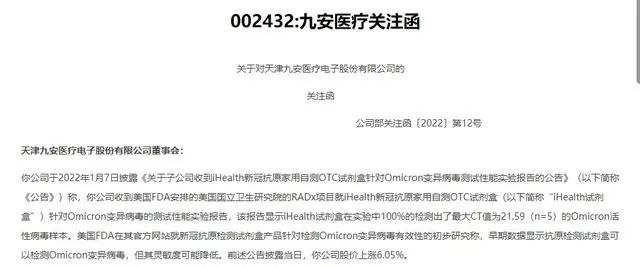 时间2月14日,一年一度的“超级碗”赛事落下帷幕。这是美国国家橄榄球联盟的年度冠军赛,广受关注,也被戏称作“美国春晚”。 作为美国广告商的无敌收割机,今年“超级碗”30秒的广告已经卖到了700万美元。要是能免费蹭上“超级碗”热点,相当于少花上千万广告费。 向来很能蹭热点的九安医疗不甘寂寞。2月14日晚,九安医疗又在投资者关系平台上发布消息称:超级碗决赛中,主办方给入场观众发放了iHealth试剂盒产品。据媒体进一步报道,现场发放了12万份试剂盒。 在国外露了脸,但在国内,九安医疗却受到了监管关注。 2月14日九安医疗公告表示,收到天津证监局下发的《行政监管措施决定书》与《关于对刘毅、邬彤采取监管谈话措施的决定》。刘毅是九安医疗董事长、总经理,邬彤则是九安医疗董秘。 正是因为邬彤对iHealth新冠抗原快速检测试剂盒的信披及投资者回应,九安医疗股价非正常上涨,两个月内最高涨幅达10倍。 据监管决定书,九安医疗未全面披露其产品的相关实验结果。因此,天津证监局要求在2月18日前对刘毅、邬彤二人进行监管谈话。 2月14日晚,九安医疗发布公告称,近日收到中国证券监督管理委员会天津监管局(发给九安医疗的《行政监管措施决定书》(以下简称《决定书》),决定对其公司董事长、总经理刘毅和董秘邬彤采取监管谈话措施。 此前,2022年1月7日,九安医疗披露称,公司于北京时间2022年1月5日晚间收到了美国FDA安排的美国国立卫生研究院(NIH)的RADx项目就iHealth新冠抗原家用自测OTC试剂盒针对Omicron变异病毒的测试性能实验报告,并称该报告显示“iHealth-Covid-19 Antigen Rapid Test在实验中100%的检测出了最大CT值为21.59(n=5)的Omicron活性病毒样本”。 公告还翻译了美国FDA在其官方网站对新冠抗原检测试剂盒产品针对检测Omicron变异病毒有效性的情况描述:FDA正在与NIH合作RADx项目,使用感染Omicron变异病毒患者样本,研究抗原检测试剂盒的表现。RADx近期经过初步研究评估了一些抗原检测试剂盒在检测被感染病患的活性病毒样本的表现,这是短期内评估其真实检测表现的最好方法。早期数据显示抗原检测试剂盒可以检测Omicron变异病毒,但其灵敏度可能降低。公告披露当日,该公司股价上涨6.05%。 《决定书》显示,此次天津证监局决定采取监管谈话措施的原因是,九安医疗在1月7日的公告中仅披露了部分检测成功的实验结果,未对全部实验结果进行披露,披露信息不完整。而刘毅作为九安医疗董事长、总经理,邬彤作为九安医疗董事会秘书,对上市公司临时报告信息披露的完整性承担主要责任。 2月15日,九安医疗针对《决定书》内容发布公司称,公司及相关人员收到上述行政监管措施后高度重视,并将严格按照监管要求积极整改,认真总结,吸取教训,加强相关人员对证券法律法规的学习,强化规范运作意识;同时加强内部控制和信息披露管理,切实提高公司规范运作水平和信息披露质量,维护公司及全体股东利益,促进公司健康、稳定、持续发展。 不过,这已不是九安医疗在近期首次引起监管关注了。记者注意到,从2021年11月16日至今,九安医疗发了12次股票交易异常波动公告和7次股票交易风险提示公告,深交所也对九安医疗下发了3份关注函和1份监管函。 1月12日晚,深交所在对九安医疗发出的监管函中表示,希望九安医疗就几个事项作出说明,主要包括:样本CT值的含义;是否以部分样本阳性检出率来混淆全部样本阳性检出率误导投资者;实验结果是否可以代表总体情况等。 1月15日,九安医疗在回复深交所关注函时称其公司之前披露的“在实验中 100%的检测出了最大CT值为 21.59(n=5)的 Omicron 活性病毒样本”,其中“最大”的含义即是代表小于等于21.59的样本可以100%检出,大于21.59的样本无法 100%检出,并称该实验“全部实验组样本阳性检出率:CT值≤21.59时可全部检出,CT值22.86时可60%检出,CT值≥23.87时完全不能检出。” 资料显示,九安医疗成立于1995年, 是一家专注于健康类电子产品和智能硬件研发生产的上市企业,同时也是一家搭建移动互联网“智能硬件+移动应用+云端服务”个人健康管理云平台的创新型科技企业。公司于2010年6月10日在深圳中小板上市,同年向移动互联网转型并创建自主创新品牌“iHealth”。近年来公司专注于健康类电子产品和智能硬件研发生产的企业,陆续推出了涵盖血压、血糖、血氧、 心电、心率、体重、体脂、睡眠、运动等领域的个人健康类可穿戴设备,并获得小米科技2500万美元战略投资,成为小米生态链合作伙伴。 2021年11月16日至2022年1月14日,约两个月的时间里,九安医疗股价曾涨幅超过10倍,一度被医药行业称为“2021年度妖股”。2021年11月8日,九安医疗称子公司的新冠抗原家用自测OTC试剂盒(胶体金免疫层析法)获得美国食药监局(FDA)应急使用授权(EUA)。消息发布后,九安医疗股价暴涨,并收获多个涨停板,到2022年1月18日其股价最高涨至88.88元,两个半月的累计涨幅超过14倍。此后,连续大涨的九安医疗股价出现调整,截至2月14日收盘,已累计下跌33.4%。 2022年1月20日,九安医疗公布2021年度业绩预告,预计实现归属于上市公司股东的净利润为9亿元—12亿元,较上年同期增长271.40%—395.19%;扣除非经常性损益后的净利润为8.5亿元—11.5亿元,同比增长243.46%—364.68%。 |