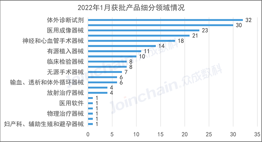 2月18日,国家药监局网站发布《国家药监局关于批准注册208个医疗器械产品公告》。 2022年1月,国家药品监督管理局共批准注册医疗器械产品208个,相较于2021年1月的117个,同比增长78%。其中境内三类产品增加65件,增幅达76%,进口产品增加23件。 其中,境内第三类医疗器械产品151个,进口第三类医疗器械产品21个,进口第二类医疗器械产品33个,港澳台医疗器械产品3个。 从细分领域来看,体外诊断试剂数量居首,为32件,无源植入器械及医用成像位列二三,为30件及23件。 数据来源:JOINCHAIN® 众成数科 从地域分布来看,北京市、广东省、江苏省分别以33、28、26件位列前三。 进口产品产地分布中,有14件产品产自德国,数量最多,其次为美国11件,日本6件。 以下为获批产品具体情况: |