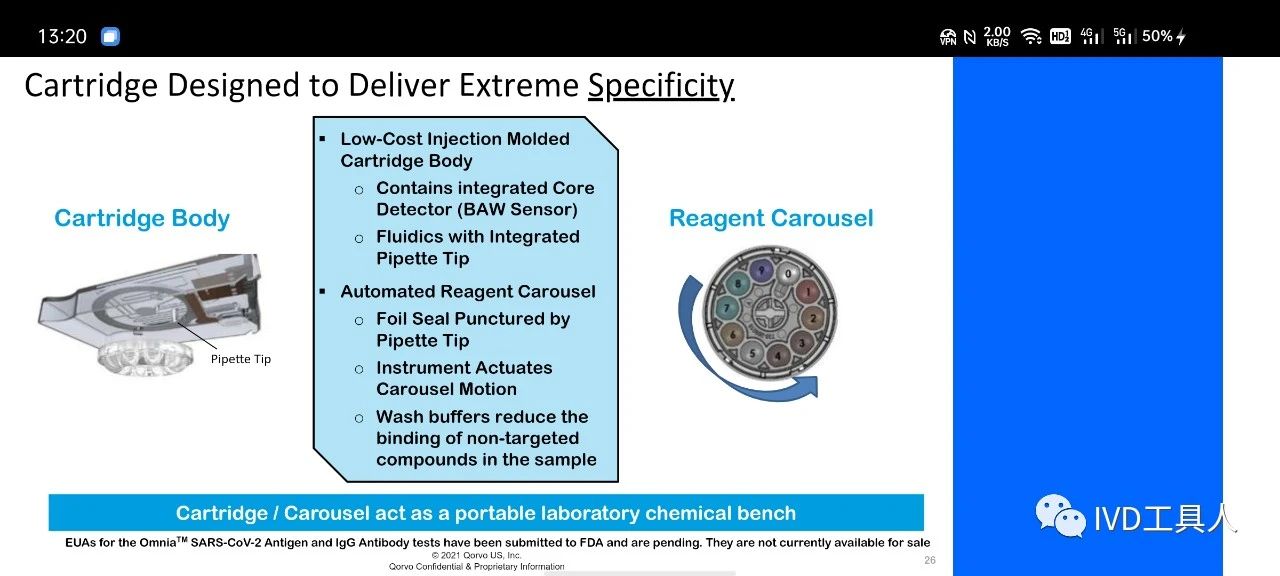 这个试剂卡下面的转盘装载了不同溶液,试剂卡上有Tip头可以插入这个圆盘。 可以看到这个试剂卡转盘上有10个孔,里面可以装载清洗液,或者试剂,清洗过程可以4到8次,极大保证了特异性。 我节选了专家讲芯片和试剂卡的2分钟,有兴趣的可以观看。