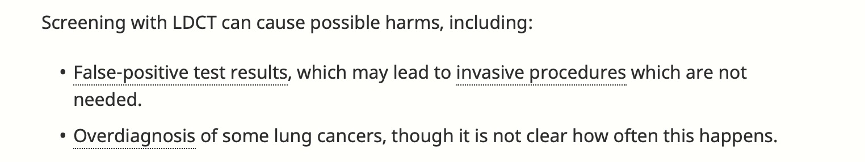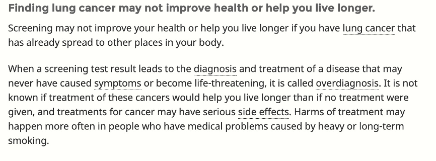 美国国立卫生研究院(National Institute of Health)有专门的癌症筛查板块,在肺癌这一部分,明确提到了基于LDCT的肺癌筛查可能无法带来健康或生存获益,中间就包括了过度诊断(overdiagnosis)