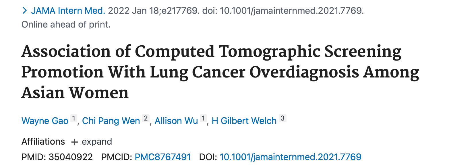 这周六晚上,有一篇推文被挺多朋友转发给了我,因为内容很抓人眼球,来自中国台湾地区的高教授团队首次证明:LDCT筛查的广泛使用,在基本不吸烟的年轻女性中会导至过度诊断,可能带来大量的过度诊断和虚高的5年生存率。