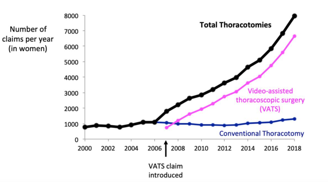原文中有个数据很有意思:女性跟肺癌治疗相关的手术量在2000年到2018年从800人次增加到8000例。