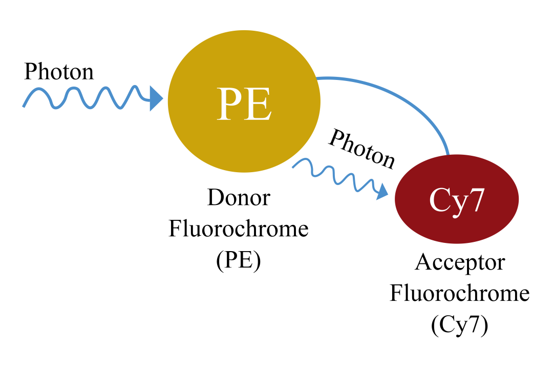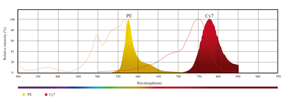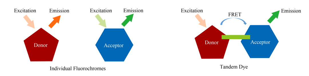 流式细胞检测就是利用流式细胞仪将液流中标记上荧光染料的单细胞或者其他微生物粒进行高速精准定量分析以及分选的生物学性质检测手段。 简单讲:将不同细胞标记上不同荧光染料,带有荧光标记的细胞排成长长的队,等待流式细胞仪的检阅,随后各个细胞经过激光发出五彩荧光,从而被流式仪分选采集出,通过荧光抗体将坏蛋细胞揪出来。 流式细胞检测可以快速、精准分析上万个细胞,涉及到环境微生物检测、常规细胞功能检测领域,临床疾病诊断方向。 流式常用荧光染料 在流式细胞检测技术发展的几十年中,荧光成为了其发展轨迹上重要代名词之一。 在流式细胞检测实验中,应用各种荧光素标记抗体是必不可少的。那么最常用的流式荧光染料有哪些呢? 这类染料是最具有历史、应用最广泛且相对较小的荧光化合物。有了国外研究基础,国内公司也陆续开始拥有自己专属染料。 从各种藻类中提取的大蛋白分子。与化学合成荧光染料相比,藻胆蛋白荧光量子产率超过90%、具备相对高的消光系数,且能够发出强烈荧光信号。 在聚合物染料没出现之前,PE和APC是最亮的染料,也是搭配低丰度抗原最佳选择。不过,藻胆蛋白很容易受光漂白影响,因此不推荐长时间或反复暴露于激发源的应用。 一个具有供体染料分子的激发和受体染料分子的发射性质的独特荧光基团。 利用荧光共振能量转移(FRET)的现象,即两个荧光分子中供体的发射光谱与受体的激发光谱重叠,且位置上距离很近时,会产生能量的转移情况,此时供体荧光分子的荧光信号发生淬灭,而受体荧光分子的荧光强度显著增强。 比起单分子染料,串联染料不仅在荧光亮度上明显增强,还可在单一激发器中实现更大的发射波长,使得检测红外区域的光谱成为可能。一个激发光源就可以使用多个染料进行研究,这依赖于串联染料扩展斯托克斯位移值(150-300 nm),即激发与发射波长的差值。 随着科研、IVD领域技术势头飞速发展,仪器不断地迭代更新,流式细胞检测技术手段已经十分成熟,仅仅单激光、单通道的流式分析,已经不能满足科研人员需求,目前的单激光、多通道流式检测技术,无论在免疫疗法、细胞分选、生物制药等其它领域都受到高度青睐。 串联染料为单激光、多通道流式检测创造可行性。 使用串联染料时,要注意其敏感性,很容易受光漂白降解,从而导至在单一激发器下受体荧光分子的发射光减弱而供体荧光分子的发射光增强,得出错误实验结果。 不过,把握以下两点可以在实验过程中有效地预防和减缓! 注意一:请勿使串联染料长时间暴露于光线下。 注意二:试验全程一定对温度进行把控,建议将细胞放在4℃或冰上。 UElandy提供的串联染料非常适合于流式抗体标记,具有水溶性大、无毒性、荧光量子产率高、斯托克斯位移大、荧光明亮、荧光不易淬灭等优势,不仅可检测低丰度靶标,还可实现流式多色搭配。 |