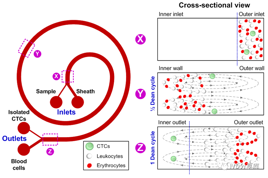 从图中可以看出,迪恩流分选芯片有两个入口(一个进缓冲液;另一个进处理后的外周血);两个出口(一个出循环肿瘤细胞;另一个出血细胞)。