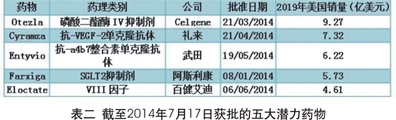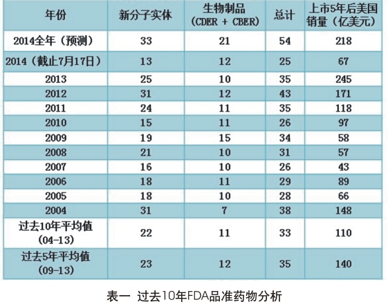 从目前美国食品药品管理局(FDA)批准的新药数量来看,2014年将有更多的新药获批上市。同时,按照预期,这些新药的市场表现也将较为强势。 新型药物,并在剩余的时间批准新药进度几乎完全符合预期,全年达到了35只小分子和生物制品,而此前的预期为38只(见表一)。