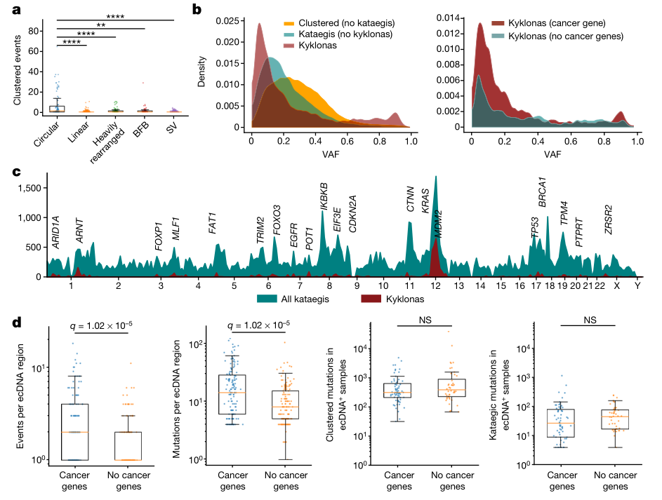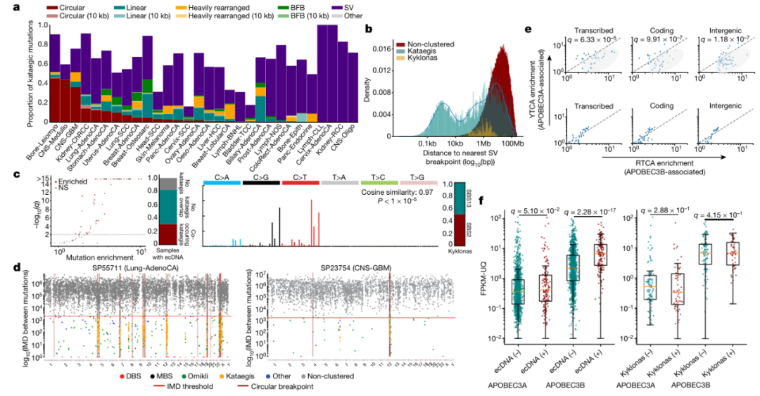 癌症是由基因引起的疾病,癌症基因组中包含着许多不同的体细胞突变,大多数单碱基替换和InDel独立的分散在基因组中。但在某些情况下这些突变会聚集。聚集体细胞基因突变在癌症基因组中不可忽视,目前的研究已经描述出几种类型的成簇突变,包括:双碱基替换(DBS),多碱基替换(MBS),弥散性超突变(omikli)和长链协调事件(kataegis)。 DBS相关研究揭示了可导至这些事件的多种内源性和外源性过程,包括DNA修复失败和暴露于环境诱变剂。MBS尚未得到全面研究,可能是由于它们在癌症基因组中的数量很少。只有少数癌症突变过程与omikli 和kataegic事件相关,其中多数事件与激活诱导的脱氨酶(AID)和APOBEC3脱氨酶家族相关。APOBEC3脱氨酶在先天抗病毒免疫过程中发挥重要作用,APOBEC3对外源性逆转录病毒具有广泛的免疫功能,个别APOBEC3家族成员还可以阻断乙型肝炎病毒(逆转录病毒的远亲)的复制。染色体外DNA(ecDNA)是独立于染色体外的相对较小的染色体颗粒,由DNA和蛋白质组成。研究表明,环状ecDNA以高拷贝数存在,通常包含已知的癌症基因,并且存在于大多数癌症中。由于cDNA的环状性质及其快速复制的特性,类似双链DNA病毒病原体,表明它们可能是APOBEC3作用的底物。近日,美国加州大学圣地亚哥分校的Ludmil B. Alexandrov教授团队在Nature上发表题为“Mapping clustered mutations in cancer reveals APOBEC3 mutagenesis of ecDNA”的研究文章。研究团队分析了来自30种癌症的2500多个全基因组数据,绘制了已知聚集性体细胞突变最全面、最详细的图谱,揭示了ecDNA中APOBEC3的突变特征,这种此前未被发现的突变模式导至了约10%的人类癌症的发展。研究发现,kataegic事件中有76.1%表现出与激活诱导的脱氨酶(AID)和APOBEC3脱氨酶家族相关的突变模式。在31%的ecDNA样本中发现APOBEC3相关的kataegis事件和染色体外DNA(ecDNA)的共同出现,并将这种情况称为kyklonas事件。文章第一作者Erik Bergstrom博士表示:“聚集突变在很大程度上被忽视了,因为它们只占所有突变的很小一部分。但通过深入研究,我们发现它们在人类癌症的病因学中发挥着重要作用。”研究团队分析了来自全基因组泛癌分析(PCAWG)项目的2583个癌症全基因组测序数据,共发现1,686,013个聚集的单碱基替换和21,368个聚集的插入缺失。DBSs、MBSs、omikli和 kataegis分别占所有样本中聚类替换的45.7%、0.7%、37.2%和7.0%。随后,对每一类估计聚集事件进行突变特征分析,识别了12个DBS、5个MBS、17个omikli、9个kataegic和6个聚集indel特征(图1)。研究人员着重分析了kataegic事件,发现所有kataegic事件中有36.2%发生在结构断点10kb范围内,但不在检测到的焦点扩增上(图2a)。kataegic事件中有21.8%发生在检测到的焦点扩增或焦点扩增结构断点的10kb内:9.6% 发生在环状ecDNA上,6.3%发生在线性重排中,3.3%发生在重排事件中,2.6% 发生在与断裂-融合-桥接循环中。42.0%的kataegic事件既不在结构断点的10kb 范围内,也不在检测到的焦点扩增范围内。对kataegic事件和近端的结构变化之间的距离分布进行建模发现(图2b):kataegis在10kb内、大约1 Mb或超过1.5Mb可检测断点。图2. Kataegic事件与大多数形式的结构变异共存。 研究发现,与ecDNA相关的kataegis(即kyklonas)与近端断点的平均距离约为750 kb,只有0.35%的kyklonic事件发生在ecDNA上和断点的10 kb内(图2b)。虽然只有9.6%的kataegic事件发生在ecDNA区域内,但超过30%的ecDNA具有一个或多个相关的kyklonic事件,这些ecDNA区域内的突变以APOBEC3模式为主。(图 2c,d)此外,kyklonic事件中APOBEC3B表现出C>T和C>G突变的富集(下划线表示该核苷酸发生突变),表明APOBEC3B可能在环状DNA中具有重要的诱变作用(图2e)。与没有ecDNA的样品相比,在具有ecDNA的癌症中检测到的APOBEC3B表达量增加(图2f)。图3. ecDNA的复发性APOBEC3超突变。