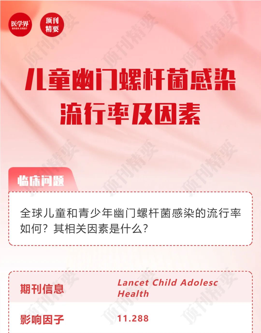 临床资讯,1s触达参考资料: [1].李兴川,王海东,张妮,王玉平,周永宁.中国儿童及青少年幽门螺杆菌感染流行病学调查的系统评价和meta分析[J].临床儿科杂志,2017,35(10):782-787. [2].Yuan C,Adeloye D,Luk TT,Huang L,He Y,Xu Y,Ye X,Yi Q,Song P,Rudan I;Global Health Epidemiology Research Group.The global prevalence of and factors associated with Helicobacter pylori infection in children:a systematic review and meta-analysis.Lancet Child Adolesc Health.2022 Mar;6(3):185-194.doi:10.1016/S2352-4642(21)00400-4.Epub 2022 Jan 25.PMID:35085494. |