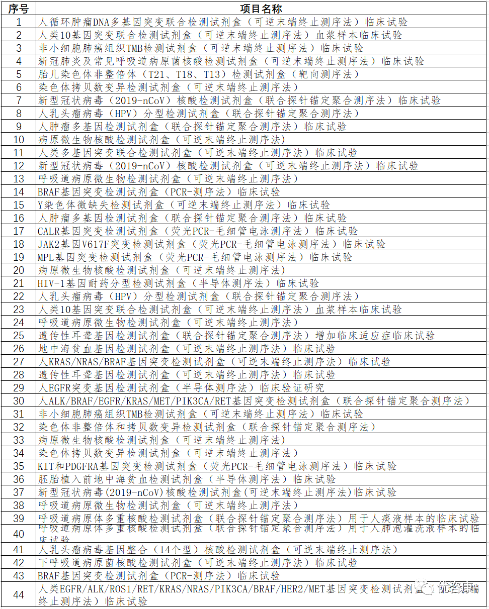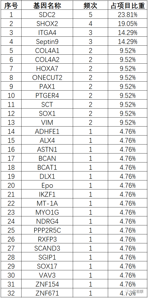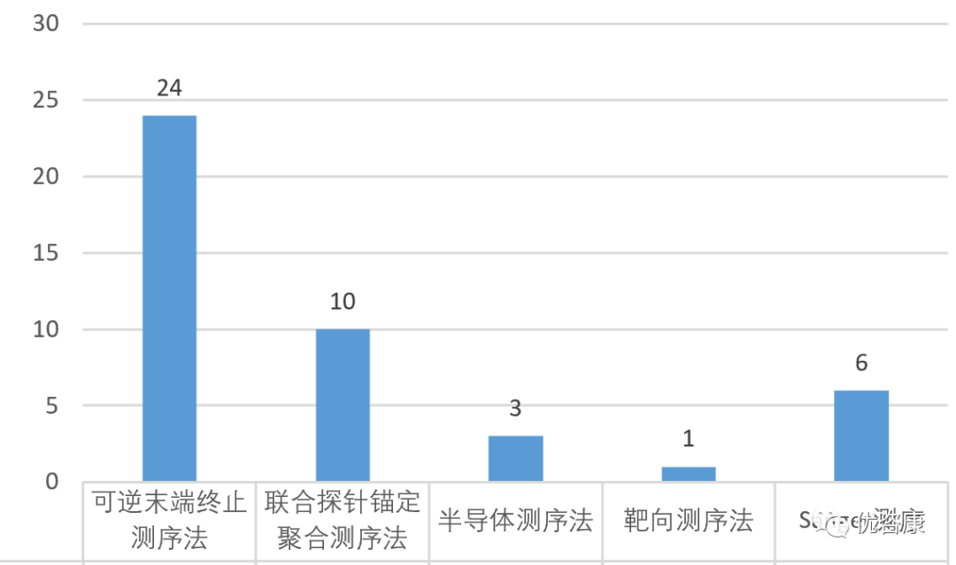 2021年IVD临床试验分析报告-中2021年进行临床试验的IVD项目(该处只指采集审批的IVD项目,不代表2021年所有的IVD临床试验,下同)按检测方法/技术划分为33类(该划分仅为笔者根据经验划分,若有不当之处,欢迎指正交流)。 其中PCR类包含:PCR-荧光探针法,荧光PCR-毛细管电泳法,PCR-SSP法,荧光PCR-熔解曲线法,PCR+导流杂交法,甲基化荧光PCR法,PCR-测序法,PCR-飞行时间质谱法,PCR-反向点杂交法,卡式荧光PCR法,PCR-量子点荧光法,PCR-流式荧光杂交法,XNA分子钳-多重荧光PCR法,荧光RT-PCR法,Gap-PCR法,数字PCR法,多重荧光PCR法和多重熔解曲线。 测序类含:NGS和Sanger测序和靶向测序法。 质谱法含:飞行时间质谱和串联质谱法。 不详定义为:项目名称中未提及方法学或方法学过于简单(根据已有经验判断不出具体方法学且非新方法学的项目)。 数量排名前四位的分别是:PCR类(256)、化学发光(142)、胶体金(47)、测序类(44),这四位占总数的73.31%,具体数据如下: 图1 项目方法学分类 测序技术作为IVD领域的重要技术之一,在2021年共进行了44项临床试验,Sanger测序有6项,采用该技术的产品变少,NGS测序有37项,这几年增速较快,其中采用可逆末端终止测序法的产品最多(占比54.6%)。NGS中病原体检测项目超过了基因突变检测项目(图3),一些项目为首次出现在官方公开数据中:人循环肿瘤DNA、呼吸道病原微生物和组织TMB等,具体数据如下(部分分类规则较为主观,仅供参考): 图2 测序项目方法学分布 图3 NGS技术应用领域分布 图4 测序项目清单 基因甲基化检测是IVD细分的热门赛道, 2021年共计有21项产品,荧光PCR为主要的技术手段(20项),数字PCR有1项,涉及32个基因,其中前三位分别是:SDC2(5项)、SHOX2(4项)、ITGA4(3项)和Septin9(3项),具体数据如下: |