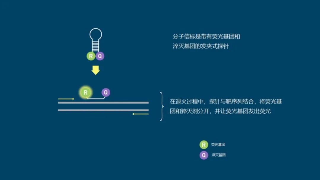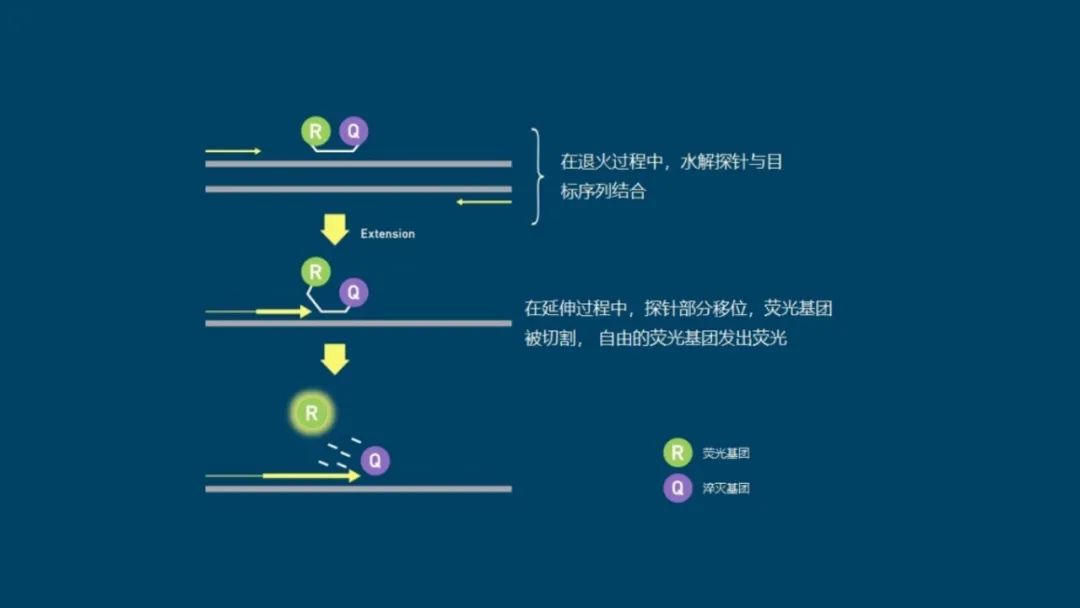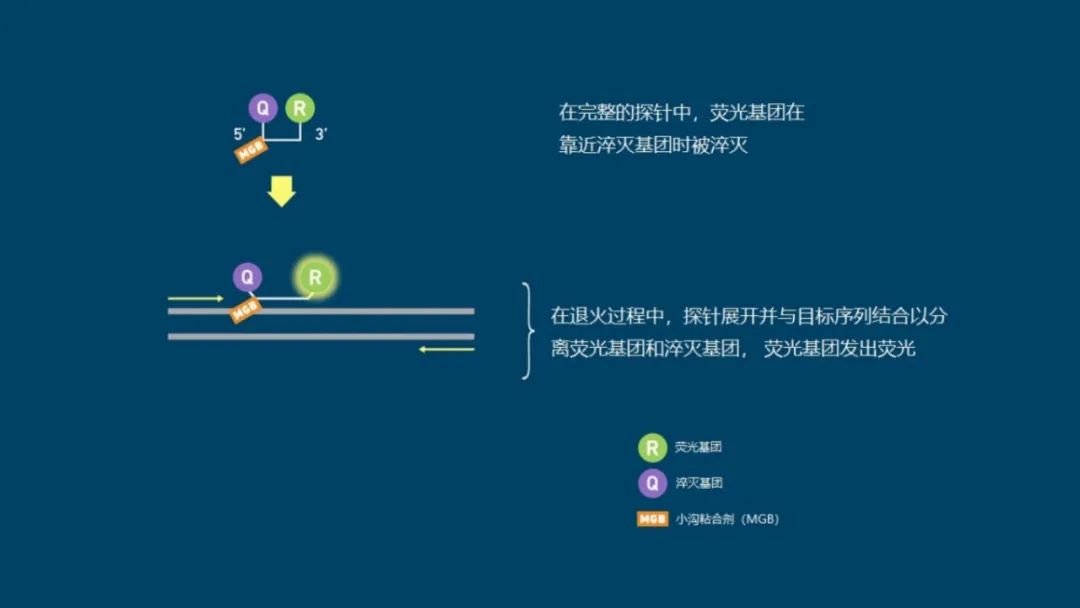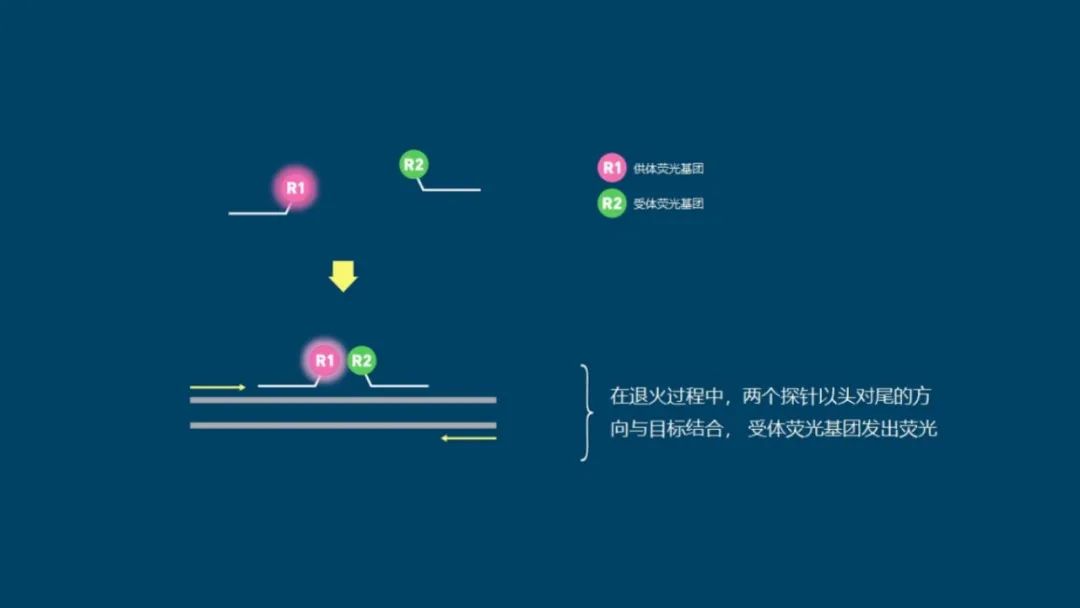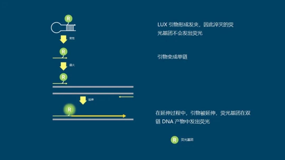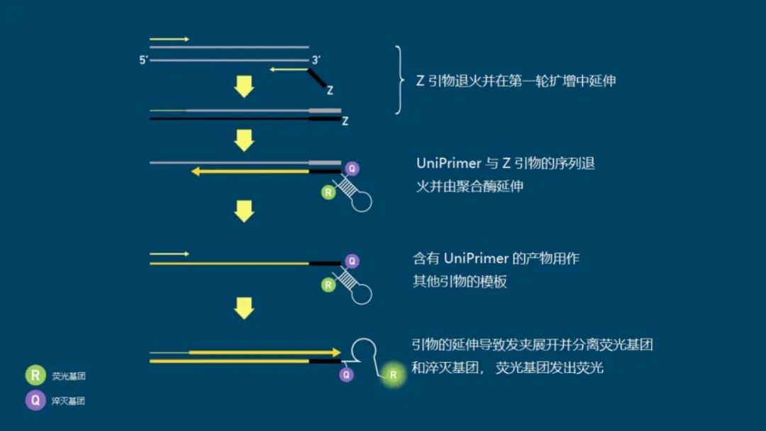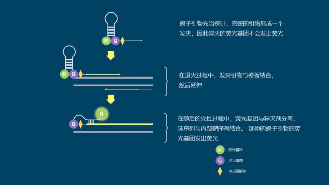 有许多不同类型的荧光探针和引物化学试剂可用于qPCR,但大多数依赖于某种形式的共价连接的荧光淬灭基团分子,该分子在特定目标序列存在时被释放。 与嵌入染料不同,探针是特异性的,因此必须为每个检测设计,增加了检测设置的复杂性和成本。然而,这确实意味着它们也提高了检测的特异性。 不同的探针通过使用不同的荧光基团可以发出不同波长的荧光,因此只要选择了兼容的探针,并且设备拥有所需的过滤器,它们就可以被复用。 虽然最初的检测开发时间可能更长、更复杂,但多路复用可以通过在一个孔中进行多项测试来减少后续的设置时间和试剂使用。 常见的荧光探针包括: 01 水解探针 水解探针,也叫TaqMan或5'核酸酶,是最常用的探针类型之一,水解探针包括一个序列特定的荧光标记的寡核苷酸探针,一端是荧光基团,另一端是淬灭基团。 当完整时,淬灭基团会抑制荧光信号。在目标扩增过程中,某些聚合酶的5'到3'外切酶活性会裂解探针,因此荧光基团不再靠近淬灭基团,从而产生荧光信号(图4)。 图4 | 水解探针的工作原理 荧光基团(R)显示为绿色,淬灭基团(Q)显示为紫色,目标DNA为灰色,扩增序列为黄色(粗线),引物为黄色(细线)。 02 分子信标 与水解探针一样,分子信标是序列特定的荧光标记的寡核苷酸探针。然而,它们的两端附近有赠送的碱基(5或6个),形成一个发夹结构,使淬灭基团靠近荧光基团并淬灭信号。 当探针与目标序列结合时,茎部变性,使荧光基团和淬灭基团分开,从而产生信号(图5)。由于其结构,分子信标探针比水解探针更难设计。 图5 | 分子信标的工作原理 荧光基团(R)显示为绿色,淬灭基团(Q)为紫色,目标DNA为灰色,引物为黄色。 03 双重杂交探针 双重杂交探针也被称为LightCycler或FRET探针,这种技术使用一对探针,旨在结合相邻的序列,用供体荧光基团和受体荧光基团对标记,表现出荧光共振能量转移(FRET)。当探针与它们的目标序列结合时,供体和受体染料接近,发生FRET,受体发出荧光(图6)。 图6 | 双杂交探针的工作原理 供体荧光基团(R1)显示为粉红色,受体荧光基团(R2)为绿色,目标DNA为灰色,引物为黄色。 04 小凹槽结合剂(MGB)探针 小凹槽结合剂(MGB)探针也被称为Eclipse探针,它们像水解探针一样在两端有一个荧光基团和淬灭基团。 然而,它们在淬灭基团附近也有一个MGB。在没有目标的情况下,MGB探针随机地盘绕,使荧光基团和淬灭基团接近。 当探针与目标物结合时,在MGB的帮助下,探针线性化,允许荧光基团发光(图7)。 图7 | MGB探针的工作原理 荧光基团(R)显示为绿色,淬灭基团(Q)为紫色,MGB为橙色,目标DNA为灰色,引物为黄色。 05 Amplifluor检测 在这里,「探针」被称为UniPrimer。 UniPrimer的一端是荧光基团,另一端是淬灭基团,在未结合状态下形成一个发夹环,淬灭信号。 在第一轮扩增中,目标特异性引物对中的一个(称为Z引物)退火并延伸,产生一个产物。 在第二轮中,这对引物中的另一个引物附着在新形成的产物上并延伸以形成第二条链。 然后,它作为UniPrimer的模板,与Z引物序列结合。延伸导至UniPrimer展开,释放出淬灭的荧光基团(图8)。 图8 | Amplifluor检测的工作原理。 荧光基团(R)显示为绿色,淬灭基团(Q)显示为紫色,目标DNA为灰色,扩增序列为深黄色,引物为黄色,Z引物为黑色。 06 蝎子探针 在这种方案中,其中一个引物也作为探针。 它在对立的两端有一个荧光基团和淬灭基团,形成一个茎环结构,当不与目标结合时,信号会被淬灭。一段与引物结合位点下游和扩增子内的区域相匹配的序列被纳入环路内。 在扩增过程中,该区域与其目标结合,导至环路断开,使荧光基团脱离淬灭基团的影响(图9)。 图9 | 蝎子探针的工作原理 荧光基团(R)显示为绿色,淬灭基团(Q)显示为紫色,目标DNA为灰色,扩增序列为黄色(粗线),PCR阻断剂为橙色,引物为黄色(细线)。 07 LUX探针 同样,基于LUX的检测的引物之一也充当探针,然而,与蝎子探针不同,它没有淬灭基团。 LUX引物的一端有一个荧光基团,采用发夹结构,本身就能淬灭荧光基团信号。当引物与目标物结合时,它变得线性化,解除了荧光基团的淬灭并产生了荧光信号(图10)。 图10 | LUX探针的工作原理 荧光基团(R)显示为绿色,目标DNA为灰色,扩增序列为深黄色,引物为浅黄色。 08 QZyme探针 在QZyme检测中加入了一个底物,其中包含一个荧光基团和淬灭基团,并保持在接近的位置。 其中一个引物包含了能够裂解底物的催化性DNA区域的反义序列。一旦扩增,该区域就会裂解底物,将淬灭基团与荧光基团分离,产生荧光信号(图11)。 图11 | QZyme探针的工作原理 荧光基团(R)为绿色,淬灭基团(Q)为紫色,目标DNA为灰色,扩增序列为深黄色,引物为淡黄色,互补的催化区为粉色和黄色。 09 LocNA探针 LocNAs是含有亚甲基桥的修饰核苷酸,限制了结构的灵活性(图12)。在探针序列中加入LocNAs可以提高特异性,便于使用较短的qPCR探针,对具有挑战性的序列有帮助。 图12 | 一个LocNAs 修改后的碱基在戊糖环的2′O和4′C之间含有亚甲基桥键(红色)。 本文节选自《qPCR简明技术手册》。 |