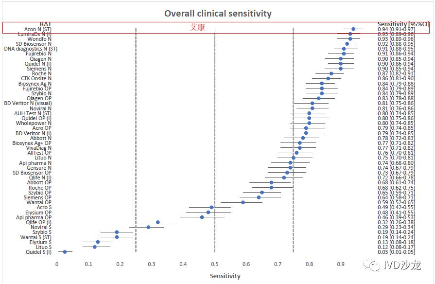 该项研究持续长达18个月,3797参与了本研究测试、共涉及6500万个检测试剂盒,其中包括西门子、罗氏、雅培等国际巨头公司,中国厂家万孚、奥泰、万泰和丽拓也位于其中。研究结果表明,最佳灵敏度的新冠抗原检测试剂是来自艾康生物的Flowflex™ 。 数据来自:Journal of Clinical Virology A nationwide analytical and clinicalevaluation of 46 rapid antigen tests for SARS-CoV compared to RT-qPCR;CPH Post online 世界卫生组织(WHO)的诊断技术评估合作中心创新诊断基金会(FIND)在瑞士日内瓦大学医院的一项研究结果也指向艾康新冠抗原自测试纸条的灵敏度在评估范围内最佳,相应结果在2021年12月22日在线发表(https://doi.org /10.1101 /2021.12.18.21268018)。特别是在奥密克戎检测表现上,远超其他产品(下图)。 I) Panbio COVID-19 Ag Rapid test device (Abbott); II) Standard Q COVID-19 Ag (SD Biosensor/Roche); III) Sure Status (Premier Medical Corporation); IV) 2019-nCoV Antigen test (Wondfo); V) Beijng Tigsun Diagnostics Co. Ltd (Tigsun); VI) Onsite COVID-19 Ag Rapid Test (CTK Biotech); VII) Flowflex (ACON Biotech).并列第二:雅培Panbio,北京泰格科信(Tigsun)并列第三:SD Biosensor/Roche, 广州万孚生物(Wondfo)并列第四:Premier Medical Corporation,北京健乃喜(CTK Biotech) “杭州艾康生物是全球胶体金快速诊断行业的顶级玩家,除了英科新创等几家老企业,国内这些锁胶体金快速诊断的企业在艾康面前都得尊称一声大哥。 艾康,没有IPO的IVD无冕之王!在全球的胶体金试纸条领域,论成本控制,产品质量,供应链,营销渠道,艾康说自己是第二,没人敢说自己是第一。”(引自公众号:医业观察《全球胶体金快速诊断“顶流”艾康的新冠抗原自测产品获批,其他12巨头慌不慌?》) 谁说胶体金没有技术含量?胶体金能到这样的效果,需要深厚的技术积累、质量体系、高品质的原料。所有获批的产品都是有效的,但新冠检测灵敏度的一点点提高,都对疫情防控成本的降低,减少传播链的延长起到巨大的作用,衷心期待国内有更多企业参与到产品性能的竞争中来。