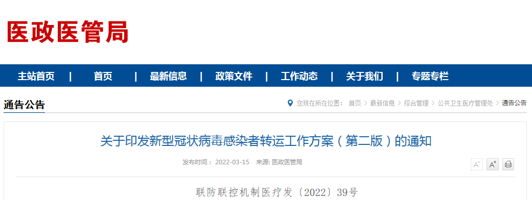 联防联控机制医疗发〔2022〕39号 各省、自治区、直辖市及新疆生产建设兵团应对新冠肺炎疫情联防联控机制(领导小组、指挥部): 为进一步指导各地切实做好新冠病毒感染者转运工作,我们根据新冠肺炎聚集性疫情处置经验,组织对《新型冠状病毒感染的肺炎病例转运工作方案(试行)》进行了修订,形成了《新型冠状病毒感染者转运工作方案(第二版)》。请各地按照本方案要求,结合实际进一步细化相关要求,并做好宣贯培训,确保转运工作安全、有序开展。