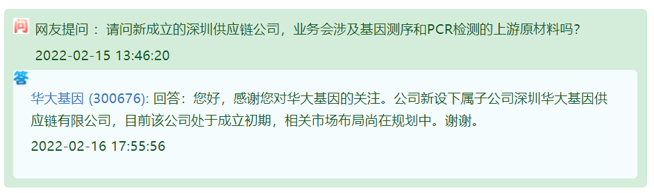 日前,深圳华大基因供应链有限公司成立,注册资本1000万元,经营范围包含:供应链管理服务;贸易经纪;第三类医疗器械经营;进出口代理等。天眼查股权穿透显示,该公司由华大基因100%控股。 这一消息马上引发了大众关注,2020年7月21日,美国商务部工业和安全局忽然宣布,将华大基因旗下子公司北京**华大基因科技有限公司、华大基因孙公司新疆丝路华大基因科技有限公司、欧菲光等11家中国企业列入“实体清单”,并将其从美国基因科技供应链中踢出。华大基因成立新公司是要做出“反击”吗?华大基因回复称:目前该公司处于成立初期,相关市场布局尚在规划中。近期华大基因披露的年度业绩快报显示,公司2021年实现营业收入67.01亿元,同比减少20.20%;实现归属于上市公司股东的净利润14.31亿元,同比减少31.55%。 |