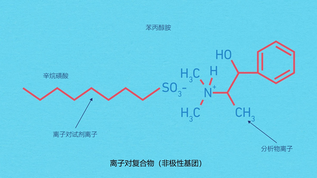 离子对试剂有长的烷基链或芳基,不像具有高电荷密度的小离子那样有溶解性。因此,它们可以吸引并与带相反电荷的分析物离子配对。
