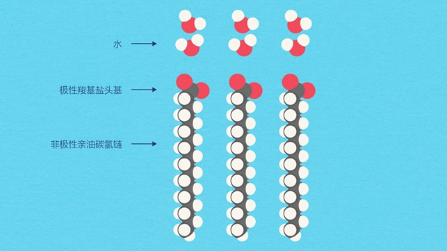 图1 | 肥皂结构,非极性的亲油烃链和极性的羧酸盐头基在水的存在下显示