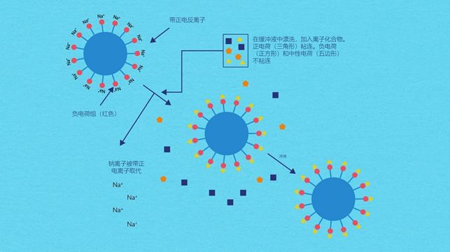 图2 | IEX的分离机制,显示了带正电样品离子与带负电基团的相互作用