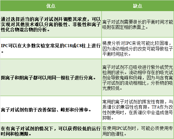 使用带电的固定相来分离带相反电荷的离子的离子交换柱很昂贵,只适合于小范围的分析物,而且分离效率有限。离子对色谱法(IPC)是一种适合于极性或离子性物质的色谱法的替代品。