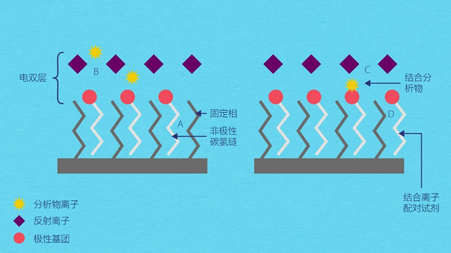 这些分子的非极性碳氢链会与柱子结合,极性基团形成一个固定的电荷层,而流动相中的离子对试剂的反离子则形成相反的电荷层。分析物离子与固定电荷发生静电吸引,能够穿透电双层。分析物分子和「带电」层之间的库仑作用导至固定相表面的电荷明显减少。