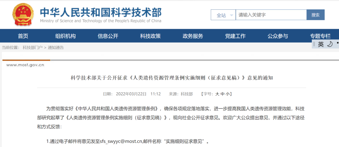 为贯彻落实好《中华人民共和国人类遗传资源管理条例》,确保各项规定落地落实,进一步提高我国人类遗传资源管理效能,科技部研究起草了《人类遗传资源管理条例实施细则(征求意见稿)》,现向社会公开征求意见。欢迎广大公众提出意见,并通过以下途径和方式反馈: 1.通过电子邮件将意见发至sfs_swyyc@most.cn,邮件名称“实施细则征求意见”。 2.通过信函方式将意见寄至:北京市海淀区复兴路乙15号,科技部社会发展科技司(邮编:100862),请在信封上注明“实施细则征求意见”字样。 3.通过传真方式,将意见发送至:010-58881471。 意见反馈截止时间为2022年4月21日。 附件:《人类遗传资源管理条例实施细则(征求意见稿)》 科学技术部社会发展科技司 2022年3月21日