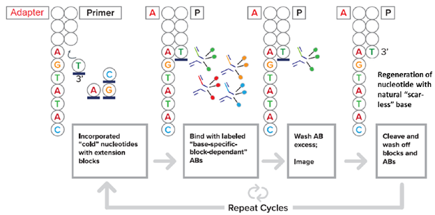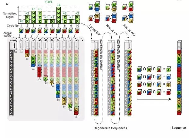 截止2022年Q1, 在不同测序平台上NMPA获批的肿瘤Panel,如下图,多集中在非小细胞肺癌、靶药的选择,区别除了文库方法、LoD最低检出限等,还在于测序仪不同。 “ 在MRD 微小残留灶应用上,不同检测Panel,不管采用何种路线,最后的呈现主要差异还在最低VAF检测水平,千分位到万分位不断改进。 关于不同测序仪,能否帮助大量的肿瘤Panel,提供差异化性能的话术呢? 测序聚合反应的差异 目前国内有多款测序仪待NMPA获批上市,如赛纳生物几个月前发布了S100二代测序仪,其特色是所谓 1.荧光发生化学测序和 2.纠错编码测序。第一点体现在荧光基团在磷酸键末端,其随着聚合反应会脱落被检测到,而在测序反应时,合成的碱基类似于天然状态,不会引入”疤痕”, 不会造成空间阻位,所谓Phasing现象。 第二点,是在每个测序循环加入2种dN4P,即2个分子组合,如首先加M组合(包括A和C碱基),续加K组合(包括G和T),完成首轮测序,还要进行第二、第三轮的分子组合测序,最终兼并3次测序链的信息得到序列。那么经过多次测序欲提高精准度,但多次测序带来的试剂消耗和TAT时间也是要评估下。初看上去还好,聚合比为:平均每个Cycle可延长约2个碱基,目前公开的评测数据较少。 碱基读取方式的差异 真迈测序仪据悉已获得临床注册受理,先看型号- 单分子测序GenoCare 1600 其碱基读取方式属于两色荧光信号,首先绿色荧光标记C 和T ,红色标记G 和A。第一轮加入2个dNTP,混合荧光先区分碱基,清洗后进入下一个循环,再加入其他2个dNTP, 由激发光区分碱基。有点类似华大CoolMPS,整个循环下来依然要拍 4张images, 速度不够快,但因为其单分子技术不需要扩增,建库简单时间短,所以整体测序时间可接受。 另外硬件方面,采用了叫total-internal reflection-fluorescence (TIRF)的光学器件,可检测单分子下的微弱信号。2台CMOS照相机可最大化单分子的信噪比。为了加速测序速度,整个Flow cell 被虚拟分为两个区块,多条Lanes。不同区块可同时进行流体化学反应,及拍照成像。 在上述体系下,GenoCare 的 mismatch, insertion 和 deletion 的错误比例分别达到 0.61% ,1.45% 和2.76%,依然有提升空间。 而另一型号GenoLab采用较传统SBS聚合, 与某进口平台对转录组等进行平行检测,对于Q20以上的碱基质量分别为94.86%和 97.5%,两者差距不算大。 华大之前发布的 CoolMPS 使用了没有荧光标记的可逆终止子,它采用特定的抗体来检测可逆终止子,如下图。 标记抗体的显著优势是:一个抗体可以标记多个荧光分子。信号更强的好处是测序的数据质量更高,即使DNA纳米球的拷贝数低,也能得到较亮信号。 荧光读取上,华大的两色读取法不同于别家的2-color成像,(别家如下图,无信号下默认为G碱基)。 而华大CoolMPS的两色荧光,使用两轮标记法,分组读取两个碱基,理论上可更好的分离染料色,相机也可以做到轻配置,在文献中有提及降低碱基错误率。但从荧光抗体结合、洗脱检测,到多轮荧光采集,整体的信号读取时间可能偏长,也成为后续升级的方面。 总体来说,肿瘤各类大、小Panel的差异可以体现在性能上,性能也可反应在测序平台,近些年将会有多个国内测序仪获批,不同测序仪采用不同的聚合反应原理、不同的信号读取方式,希望让各个Panel 变得更有特点。 Reference 1.Fang Chen,Two Color Single Molecule Sequencing on GenoCareTM 1600 Platform to Facilitate Clinical Applications,medrxiv,2020 2.Snezana Drmanac, CoolMPS: Advanced massively parallel sequencing using antibodies specific to each natural nucleobase, bioRxiv, 2020 |