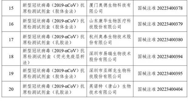 国家药监局再批准一款新冠抗原试剂,来自北京卓诚惠生。目前,国家已经批准21款新冠抗原试剂。  14款胶体金法:分别是广州万孚生物、南京诺唯赞、北京热景生物、北京万泰生物、天津博奥赛斯、北京乐普医疗、重庆明道捷测、武汉明德生物、浙江东方基因、重庆中元汇吉、山东康华生物、厦门奥德生物、深圳亚辉龙、北京卓诚惠生。 4款乳胶法:北京金沃夫、杭州奥泰生物、艾康生物、英诺特;3款荧光免疫层析法:深圳华大因源、北京华科泰、深圳易瑞生物。
