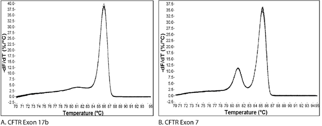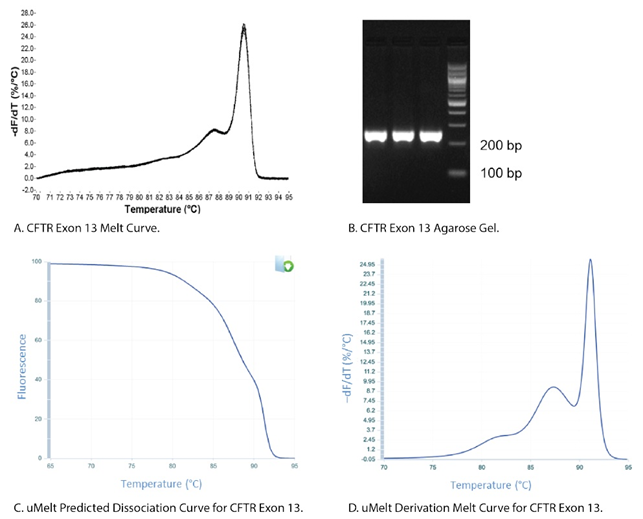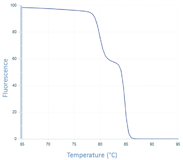 研究人员经常使用熔解曲线分析来评估他们的插入染料PCR/qPCR检测是否产生了单一的、特异的产物。扩增的特异性被认为是插入染料检测比基于探针的检测更值得关注的问题,因为插入染料与任何双链DNA产物结合,不具有序列特异性。 在基于探针的检测中,扩增子特异性引物从探针中获得额外的特异性,探针是第三个序列,必须在目标序列的扩增子中结合,以产生荧光信号。 熔解曲线分析经常被用作一种诊断工具,用于评估插入染料qPCR检测的扩增子长度。在此,我们解释熔解曲线是如何产生的,检查正在使用的假设,并描述一些可用于进一步分析熔解曲线结果的额外方法。 01 一个峰等于一个扩增子,是这样的嘛? 图1显示了两个不同扩增子的熔解曲线。来自CFTR外显子17b的扩增子观察到的单峰(图1A)通常被解释为代表一个纯的、单一的扩增子。相反,来自CFTR外显子7的扩增子的熔解曲线(图1B)显示了2个峰,这一结果通常被解释为表明有两个独立的扩增子。 图1 | 来自CFTR基因的qPCR的熔解曲线。 (A)CFTR 外显子17b的扩增子在熔解曲线分析后显示一个峰,而(B)外显子7的扩增子产生两个峰,通常被解释为代表多个扩增子,而在这种情况下,只产生一个扩增子(图2B)。 事实上,图2所示的凝胶电泳的后续分析显示,这两条曲线都产生一个扩增子,验证了一个PCR产物。为了解释这些明显矛盾的结果,我们需要检查熔解曲线是如何产生的。 图2 | qPCR产物的琼脂糖凝胶电泳显示为单一扩增子。 在溴化乙锭染色的琼脂糖凝胶上分析qPCR扩增子,显示CFTR基因的(A)外显子17b和(B)外显子7均为单条。 02 熔解曲线是如何产生的? qPCR中使用的插入染料只有在与双链DNA(dsDNA)结合时才会发出荧光。在有单链DNA(ssDNA)的情况下,或者当染料在溶液中游离时,它们不会发荧光。 通常情况下,用于运行qPCR的热循环仪被设定为在扩增循环完成后产生熔解曲线。在qPCR运行结束时,热循环仪在一个预设的温度(通常高于引物Tm;如65℃)开始,并测量荧光的数量。 然后在仪器继续测量荧光的过程中,样品的温度被逐步提高。随着温度的升高,dsDNA变性成为单链,染料解离,导至荧光下降(图3)。 图3 | CFTR外显子17b扩增子的解离曲线。 测量荧光随温度升高的变化。随着温度的升高,扩增子的2条链分离,形成单链DNA,导至荧光插入染料与DNA解离,停止荧光。 然后将该曲线的斜率变化作为温度的函数绘制出来,得到CFTR 外显子17b的熔解曲线(图1A)。 对这一曲线的解释是基于这样的假设:扩增子处于2种基本状态中的一种,即双链或单链;也就是说,当dsDNA开始熔解时,它迅速解体,没有中间状态。这一点经常被观察到,因此可以得出一个简单的、通用的规则。 然而,如果我们将这一规则应用于CFTR外显子7的熔解曲线(图1B),两个峰值将被解释为两个不同扩增子的熔解事件。但我们知道CFTR外显子7的扩增子是一个单一的DNA产物(图2B)。那么,我们如何将这两个相互矛盾的想法统一起来呢? 03 DNA熔解是一个多状态的过程 需要重新评估DNA熔解是基于2个状态的事件(dsDNA和ssDNA)的假设。如果我们允许DNA有可能承担一种既不是dsDNA也不是ssDNA的中间状态,并重新审视CFTR外显子7熔解实验的原始数据(图4),就有可能以另一种方式解释数据。 图4. | CFTR外显子7的解离曲线。 随着温度从65℃升高,测量荧光的变化。随着温度的升高,扩增子的2条链分离,形成单链DNA,导至荧光插入染料与DNA解离,停止荧光。曲线在80℃和85℃之间的肩部表明存在一种中间状态,即DNA既是双链又是单链结构。 当dsDNA开始熔解时,扩增子中比较稳定的区域(如富含G/C)不会立即熔解。这些稳定的区域保持它们的dsDNA构型,直到温度足够高而导至其熔解。这种情况导至了2个熔解阶段。 图4中的数据与这种解释是一致的,这导至了图1B中的曲线。额外的序列因素也可以导至产品在多个阶段熔解。这些因素包括富含A/T区域的扩增子错位,以及在扩增子区域有二级结构的设计。 04 其他扩增子分析方法 4.1 琼脂糖凝胶分析 分析qPCR产物的黄金标准仍然是对反应的一部分进行琼脂糖凝胶显像。单一条带的出现表明是单一产物(图2)。 4.2 uMelt℠ 另外,为了减少确认单一扩增子存在所需的凝胶数量,可以使用uMelt熔解曲线预测软件,这是一个可靠、灵活、免费的在线工具,由犹他大学创建。这个程序可以预测qPCR长度的扩增子的熔解曲线及其衍生物,非常适合测试单个扩增子产物中的多个峰。 uMelt可以稳健地预测熔解曲线的形状和解离过程中出现的复杂的熔解转变。递归地使用最近邻热力学,通过一个非常容易获得和使用的界面,计算出不同温度下扩增子的螺旋度。 uMelt采用的算法已经过同行评议[1],用户可以从各种设计迭代中进行选择,使该程序越来越受欢迎。 尽管大多数qPCR母液是专有的,但犹他大学的科学家们发现,该算法在各种条件下和各种母液中都能得到一致的曲线形状。变化的主要参数是扩增子熔解的温度;曲线的形状和预测峰数的能力保持不变。 图5显示了qPCR熔解曲线、反应产物的溴化乙锭染色凝胶和同一扩增子(CFTR 外显子13)的uMelt预测。uMelt预测的熔解曲线的导数与热循环仪的实际测量结果密切相关。 图5 | CFTR 外显子13的比较分析。 对CFTR外显子13产生的扩增子进行了仪器衍生、琼脂糖凝胶和uMelt分析的比较。 (A)仪器得出的熔解曲线表明存在两个扩增产物。 (B)溴化乙锭染色的琼脂糖凝胶