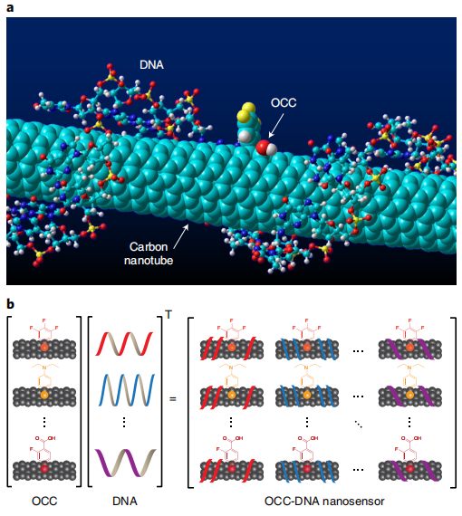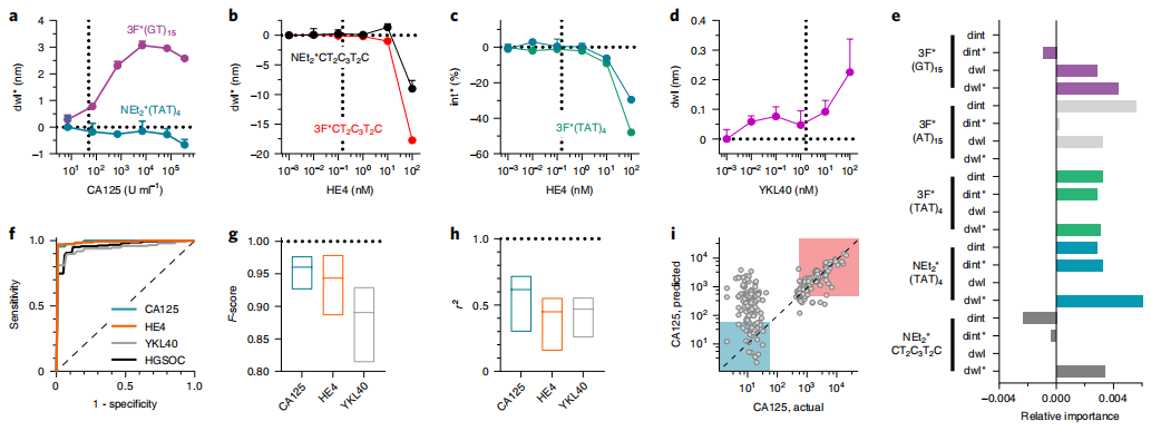 卵巢癌是全球第二常见的妇科恶性肿瘤,每年造成184000多人死亡。如果没有迹象表明癌症已经扩散到卵巢以外,5年生存率超过90%。然而,59%的病例在转移到远处后才被诊断出来,5年生存率下降到只有29%。早期发现卵巢癌并及时测量疾病进展和复发将显著改善预后。 传统上,血清生物标记物测量,如癌症抗原125(CA125)的测量,被用作一线检测和/或监测高危女性卵巢癌。其他补充血清生物标记物,如人类附睾蛋白4(HE4)、几丁质酶-3样蛋白1(YKL40)和间皮素,或一组生物标记物,比基于CA125的筛查具有更好的鉴别能力。然而,由于特异性有限和阳性预测值(PPV)较低,独立的生物标志物测量已被证明对存活率几乎没有益处。纵向CA125测量与经阴道超声检查相结合,可提高卵巢癌检测的PPV,但筛查的益处仍不明确。目前,没有筛查策略能够在足够早的阶段识别疾病,从而降低死亡率。 为了寻找克服诊断挑战的替代方法,研究团队研究了一种基于感知的策略。自然界已经进化出了识别和解释针对目标异质性的多维刺激的感知。感知是通过使用大量感官输入来实现目标识别,其中每个感官输入对目标的某些特征进行编码,并根据预先学习的目标模式库分析这些输入。例如,嗅觉使用一系列非特异性嗅觉受体,其反应模式由大脑中的神经网络处理,以识别气味。嗅觉感受器的数量相对较少(100-200),但通过感知,它们可以识别许多不同的气味,远远超过一对一识别的可能。对于这些气味,虽然每个信号产生的预测值相对较小,但作为一个整体处理的完整响应阵列仍能实现准确识别。 基于感知的方法已被用于根据DNA序列甲基化的不同模式、使用电子鼻的挥发性有机化合物、使用质谱的小代谢物、病理学图像分析、计算机断层扫描和磁共振成像数据对各种疾病进行分类。机器学习过程可以识别疾病特定的模式,这些模式太微妙或太复杂,无法被人眼或传统分析方法检测到,并有助于构建稳健的诊断模型。尽管人们努力开发一种利用病理学或放射成像数据进行基于感知的诊断筛查的通用方法,但在识别有效的疾病标记物以实现高灵敏度和高选择性以及临床实用可行性方面仍然存在挑战。 近日,来自美国多家知名大学和医学中心的研究团队在NATURE BIOMEDICAL ENGINEERING杂志上发表了一篇题为“Detection of ovarian cancer via the spectral fingerprinting of quantum-defect-modified carbon nanotubes in serum by machine learning”的文章,在文章中,研究团队设计了一个纳米传感器阵列和一个计算模型,该模型基于感知从患者血清样本中检测卵巢癌。为了传递生物流体的多种物理化学性质,研究团队使用OCC功能化单链DNA(ssDNA)的封装单壁碳纳米管设计了纳米传感器阵列。半导体单壁碳纳米管(SWCNTs)表现出固有的近红外荧光,环境响应性下降到单分子水平。SWCNTs (E11)的发射对介电环境、氧化还原扰动和静电电荷敏感。OCC-DNA纳米传感器的发射对从高级别浆液性卵巢癌(HGSOC)、其他非HGSOC疾病(包括缓解期患者、其他妇科疾病,如子宫内膜异位症和低度卵巢癌、非妇科癌症和其他疾病)患者和健康人身上采集的血清样本表现出不同的反应,但用传统的统计分析,光学反应并没有提供实质性的预测价值来区分这些患者。因此,研究团队训练了几个机器学习模型对HGSOC患者进行分类。SVM模型使HGSOC检测具有良好的灵敏度和特异性,准确率接近95%,优于传统的基于血清生物标志物的识别。研究团队还使用此方法评估已知卵巢癌血清生物标记物(包括CA125、HE4和YKL40)所赋予的预测价值。支持向量回归模型显示,传感器元件对这些标记物有定量反应,但它们并不能解释所有的预测值,这表明未知生物标记物在区分HGSOC中起着重要作用。 主要内容 OCC-DNA纳米传感器阵列 研究团队合成了一系列OCC-DNA纳米传感器,并用单链DNA文库将其封装,以将纳米传感器溶解在生物流体中。单链DNA序列的选择基于DNA的识别序列,该识别序列在SWCNT表面形成特定的包裹图案,从而形成多样的、高度定义的表面形态,从而赋予对局部环境的不同敏感性。由三个OCC和四个DNA序列的组合合成了十种不同的OCC-DNA纳米传感器。 为了确定从患者样本中提供最多样化反应的最小OCC-DNA组合,测量了OCC DNA对HGSOC患者和健康个体血清样本的荧光光谱反应。将两种条件下的四份血清样品与10种不同的OCC DNA孵育2h,获得OCC-DNA复合物的荧光光谱。研究团队选择了六个对健康组和癌症组的反应有统计学显著差异的OCC-DNA纳米传感器,其HGSOC和健康组之间的差异具有统计学意义(P<0.10)。 OCC-DNA纳米传感器阵列 图片来源:Nature biomedical engineering 用于HGSOC分类的机器学习算法优化 研究团队将OCC-DNA传感器阵列暴露于215份患者血清样本中,并构建了一个包含由血清环境引起的光谱特征变化的数据集。这组血清样本收集自49例HGSOC、51例其他妇科疾病(如子宫内膜异位症和低度卵巢癌)、29例非妇科癌症、25例缓解期癌症患者(包括7例HGSOC)和61例健康献血者。研究团队多次优化了机器学习算法,最后得到的SVM模型在98%的特异性下产生87%的敏感性。 为了进一步评估传感器阵列和算法的鲁棒性,研究团队在相同条件下合成了一批新的OCC DNA,并收集了传感器阵列对54个患者样本的独立测试集的响应数据。为了评估模型在各种医疗条件下的性能,从不同的患者中取样测试集,包括7例HGSOC、5例其他妇科疾病、32例非妇科疾病和10例