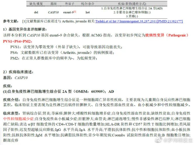 (本文转载自罗祎明医生新浪微博 (https://weibo.com/u/1042973271),略作编辑。原文以第一人称讲述。) 个人体会,中国目前最为空白的一个临床科室,不是康复科、不是Palliative Care“姑息医学科”,而是Medical Genetics医学遗传科(不是指遗传研究,而是通过解读患者的基因检测结果,诊断疾病的临床科室)。最近遇到了一个特殊的病例,恰好展现了一个临床领域的空白所带来的问题。 一个国内六个月的宝宝,出现不明原因的中性粒细胞减少,减少程度并不严重,也没有出现反复或严重的感染,且没有其他症状或检查异常。当地医生做了详细的检查,包括“全外显子测序”,结果显示患者有一个CASP10的基因变异,这个孩子的CASP10有4个外显子全部丢失,预计所产生的蛋白质会没有功能。基因检测报告截图见下图: 已知CASP10变异可以导至一种叫做“自身免疫性淋巴细胞增生综合征”(autoimmune lymphoproliferative syndrome, ALPS)的疾病,该病属于常染色体显性遗传病,机制是淋巴细胞凋亡受阻,导至异常的淋巴细胞增生,从而导至自身免疫和淋巴增生表现,包括中性粒细胞减少等。而已知CASP10是促进细胞凋亡的基因,CASP10的致病变异可以让细胞凋亡过程受阻,导至ALPS这个疾病,而且还是常染色体显性遗传(即一个致病变异即可发病)。而这个孩子的CASP10基因4个外显子全部丢失,预计基因功能会完全丧失,诊断ALPS似乎是顺理成章的事情。这也是基因检测报告的意见(“致病性变异”),国内的大医院医生也是这样认为。 但是,这里却有两点不对劲。一方面,文献搜索CASP10这四个外显子缺失,发现日本报道了一个家庭,父亲和两个孩子三口都有这四个外显子缺失,却没有一人患上ALPS,而只有一个孩子得了关节炎(PMID: 21382177);另一方面,孩子的αβ double negative T cells是正常的,提示至少现在没有发病。 为什么日本一家三口的CASP10丢失了4个外显子却没有发病,于是我专门去查了一下CASP10这个基因。国际上的遗传学大佬们搞了一个叫 gnomAD(The Genome Aggregation Database)的数据库,里面集合了20万人的基因组数据信息,并且根据这些信息做了很多有意义的分析。在gnomAD数据库上,发现CASP10这个基因,人群中有较高比例的人有着预测可以导至功能完全丧失(移码变异frameshift mutation,变异结果是终止密码子nonsense mutaion,外显子和内含子相连的剪切位点的变异splice site mutation,或者这种大片段的外显子丢失)的变异,远远高于ALPS这个罕见病的发病率。同时CASP10这个基因的pLI (probability of being loss-of-function intolerant) 评分是0。意思是说,一个人有两条染色体,每条常染色体上有分别来自父母的一套相同的基因,这上面如果某个基因即使完全失去功能,只要另外一个没问题,对个体健康就不会有影响。也就是说CASP10这个基因,人群中本来就有不少人(两个基因之一)是完全没有功能的,而这些人完全健康。 |