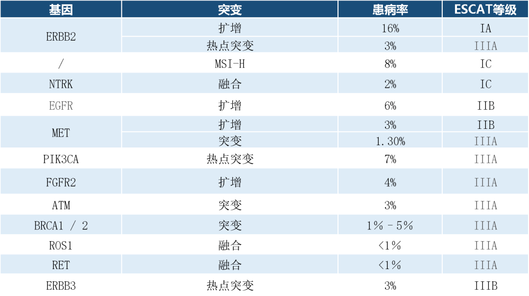 与传统的癌症基因分型方法不同,NGS 癌症伴随诊断可以在一次单一检测中同时检测到与患者癌症相关的所有基因组改变和生物标志物,显著降低了成本,同时提高了准确性。目前针对各类癌种的相关标志物和靶向以及免疫治疗的种类已经比较丰富。为了进一步规范NGS的应用决策,欧洲医学肿瘤学会(ESMO)在旗下期刊Annals of Oncology正式发布了转移性癌症患者NGS指南。这份指南由ESMO转化研究和精准医学专家组参与,并基于ESCAT(分子靶点临床可行性量表,见表1)以及有效靶向药物的情况,进一步评估NGS对于每种肿瘤类型的效率和临床价值制定建议。这也是关于二代测序使用的一个重要指南,将给临床医生和患者意义重大的治疗指导。- 特别强调在晚期非鳞状非小细胞肺癌、前列腺癌、卵巢癌和胆管癌中使用肿瘤多基因二代测序。