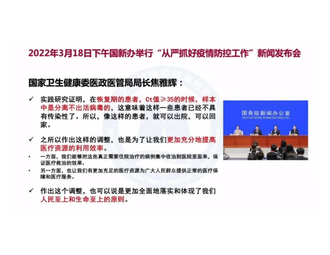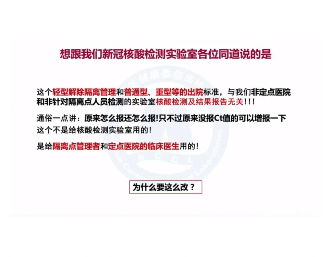 日前,国家卫健委发布《新型冠状病毒肺炎诊疗方案(试行第九版)》,将此前解除隔离管理及出院标准修改为"连续两次新型冠状病毒核酸检测N基因和ORF基因CT值均≥35(荧光定量PCR方法,界限值为40,采样时间至少间隔24小时),或连续两次新型冠状病毒核酸检测阴性(荧光定量PCR方法,界限值低于35,采样时间至少间隔24小时)"。