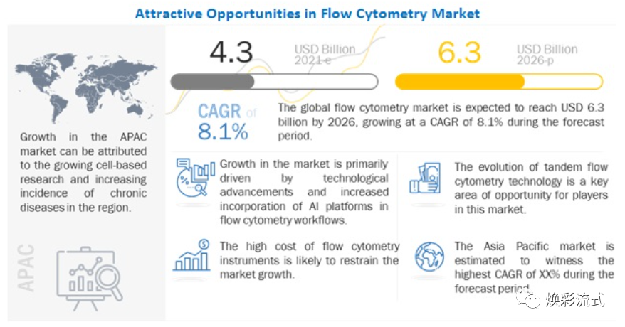 根据最新报告显示: 流式细胞市场预计将以 8.1% 的复合年增长率从 2021 年的 43 亿美元达到 2026 年的 63 亿美元。流式细胞仪市场的增长主要受全球艾滋病毒发病率和流行率上升的推动/艾滋病和癌症,研究和学术界越来越多地采用流式细胞术,免疫学和免疫肿瘤学研究领域的公私合作不断增加,技术进步,以及人工智能平台越来越多地融入流式细胞术工作流程和流程的进步细胞仪软件。 医疗保健在这两年成为了经济复苏的核心,然而2022年全球医疗保健支出将同比增长4.1% ,比去年2021 年9% 增长放缓。全球GDP的比重来说,医疗保健支持将保持在10.5%,在人口老龄化,治疗进步和公共医疗保健系统扩展的推动下,全球保健支出仍在上升。 流式市场在大的医疗环境下,维持8.1% 的增长也是不错的表现和增长势头。 市场细分 流式细胞仪市场根据技术、产品、应用和最终用户进行细分。