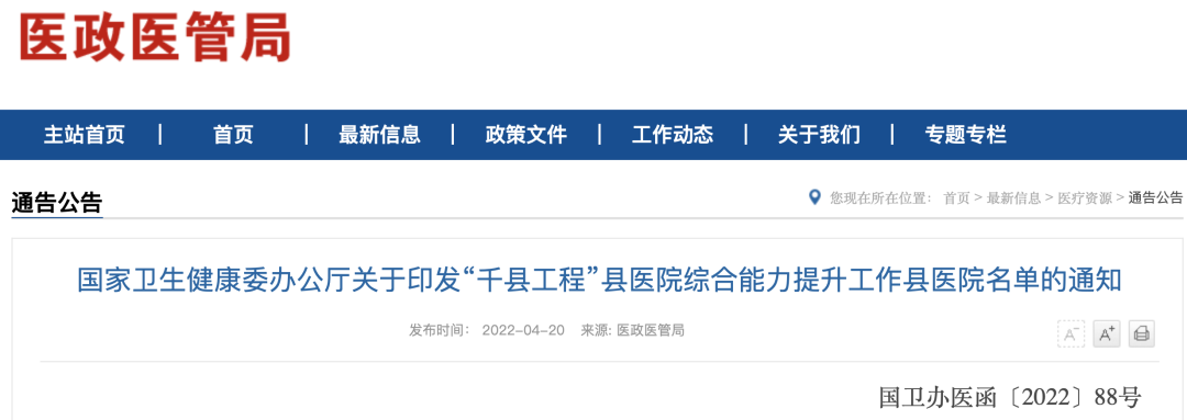 该文件明确指出,根据《国家卫生健康委办公厅关于印发“千县工程”县医院综合能力提升工作方案(2021-2025年)的通知》,结合“十三五”时期全国县医院医疗服务能力评估和各地推荐情况,我委研究确定了首批纳入“千县工程”县医院综合能力提升工作的县医院名单。现将名单印发给你们,请认真组织落实有关工作要求。我委将对纳入“千县工程”的县医院进行动态管理,结合全国县医院医疗服务能力年度评估情况和各地工作进展情况,适时调整县医院名单。
