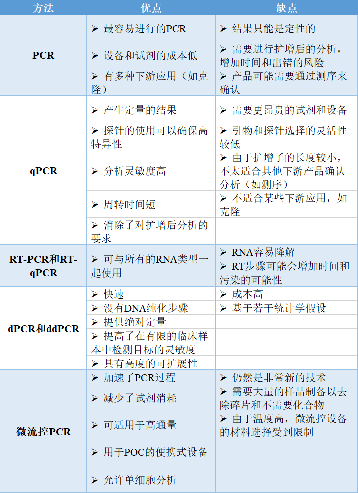 不同的PCR方法都有优点和缺点,对它们所适合的应用产生影响[7]。表1总结了这些优点。
