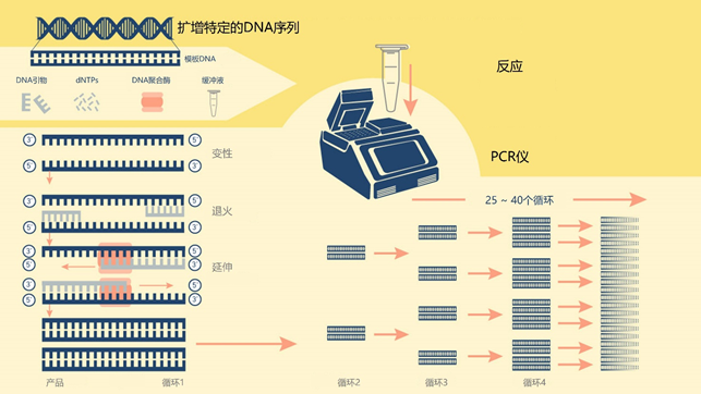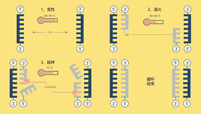 这些步骤中的每一个都被称为循环,重复30 ~ 40次,每个循环的DNA数量翻倍,获得扩增(图2)。