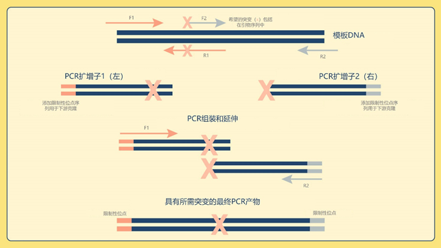 PCR克隆是一种广泛使用的技术,通过PCR扩增的双链DNA片段被插入载体(如gDNA、cDNA、质粒DNA)。例如,这使得创建的细菌菌株的遗传物质被删除或插入。定点诱变也可用于通过克隆引入点突变。这通常采用一种被称为重组PCR的技术,其中重叠的引物被专门设计来纳入碱基替换(图4)。这种技术也可用于创造新的基因融合。
